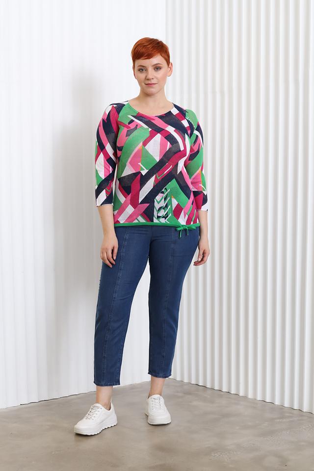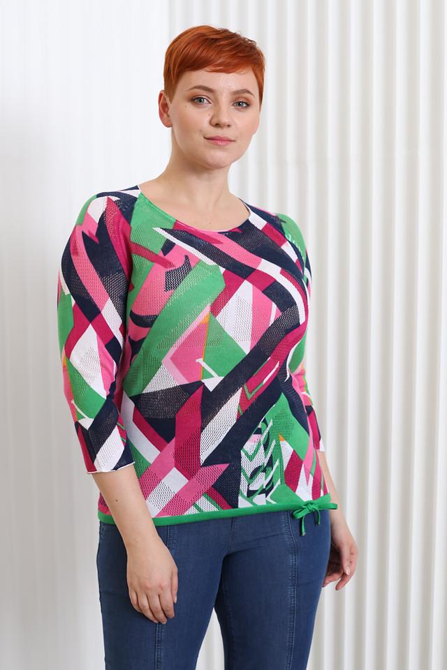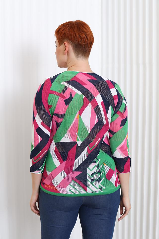 Дизайн пуловера отличается ярким геометрическим принтом, сочетающим в себе оттенки розового, зелёного, синего и белого. Короткий рукав и округлый вырез горловины придают модели лёгкость и непринуждённость.