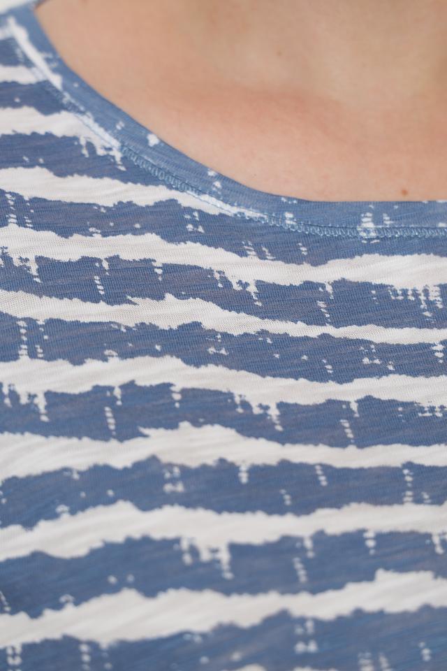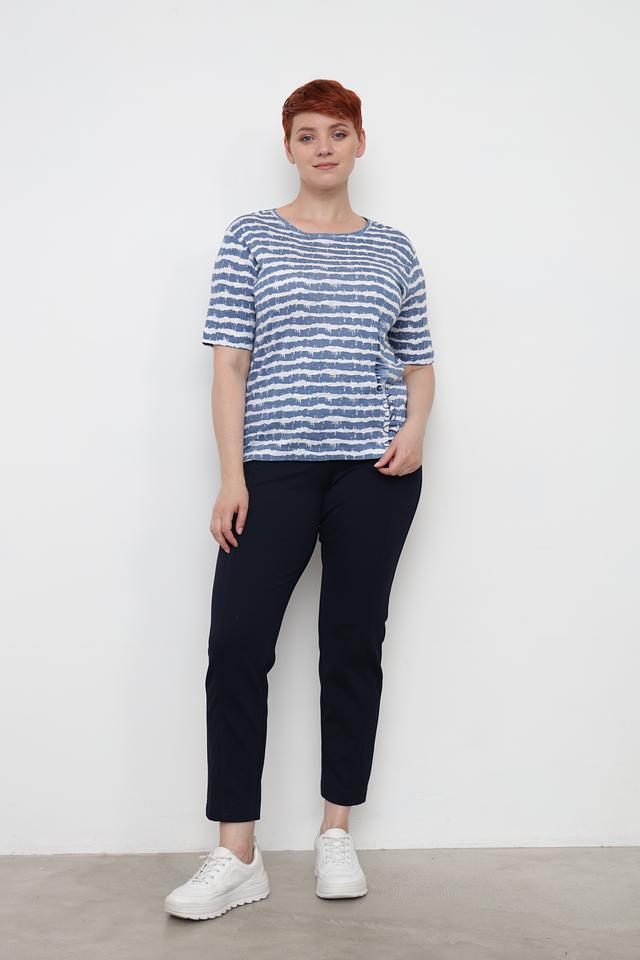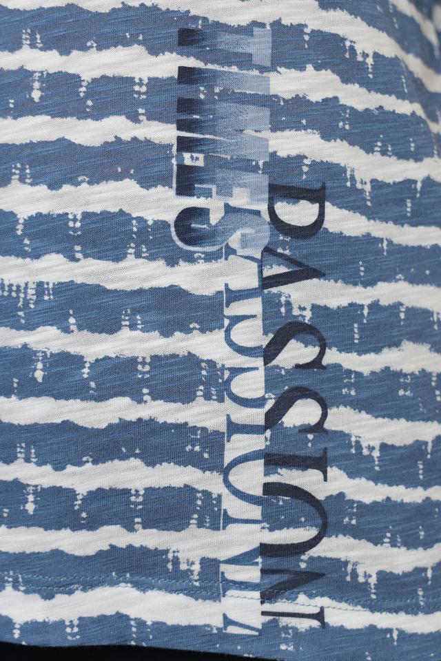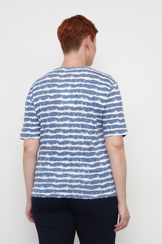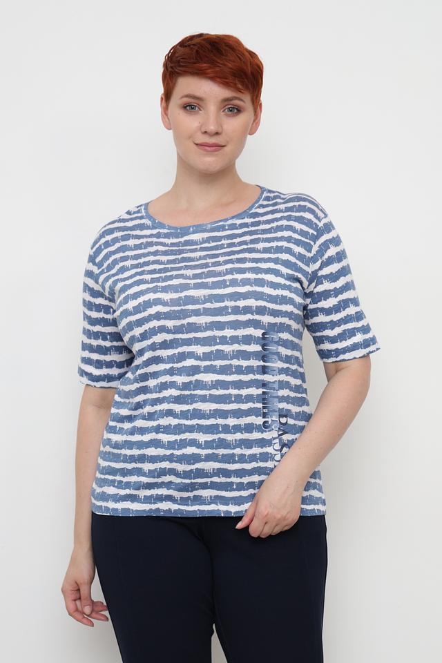 Женская футболка Rabe collection голубого цвета с оригинальным полосатым принтом. Изготовлена из мягкой и приятной к телу ткани на основе вискозы и хлопка, обеспечивающей комфорт в носке. Отличный выбор для создания повседневных образов. Состав: вискоза 50%, хлопок 50%