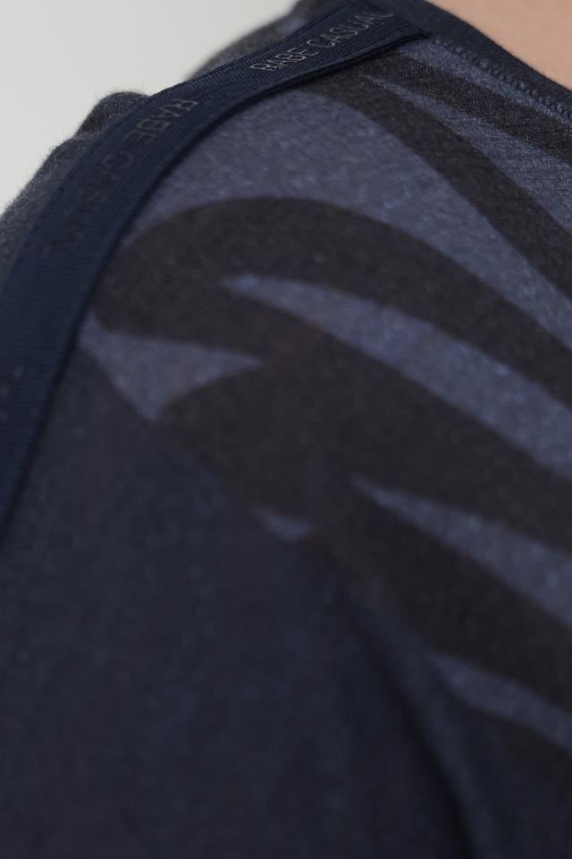 Основной цвет футболки – тёмно-синий, который служит фоном для яркого и оригинального принта. Принт выполнен в абстрактном стиле, сочетая в себе элементы голубого, оранжевого и белого цветов.