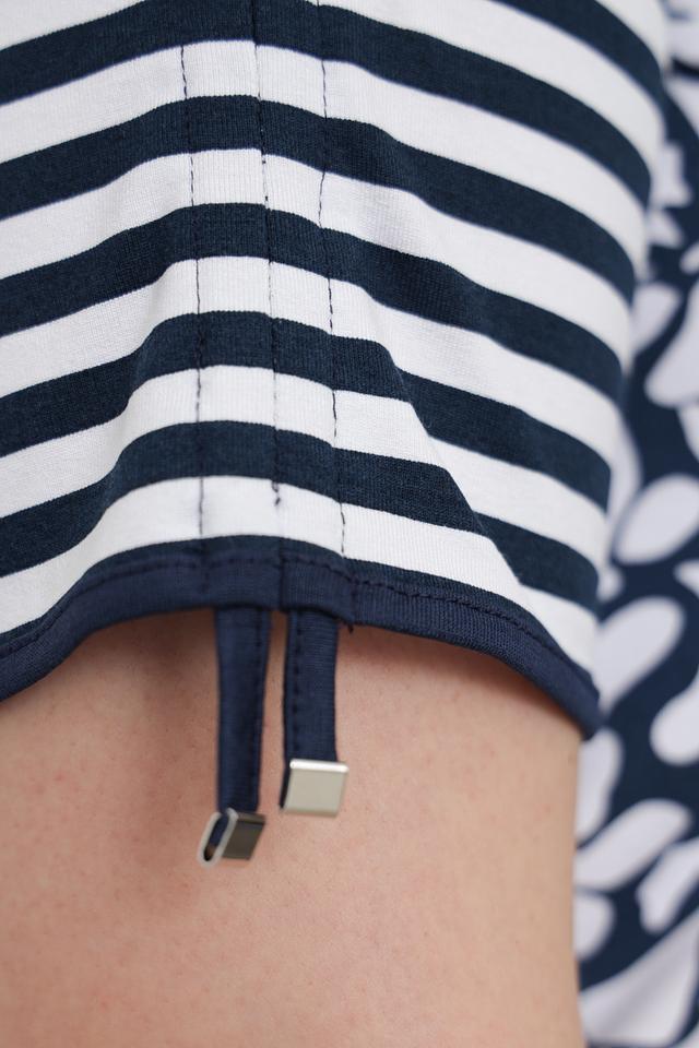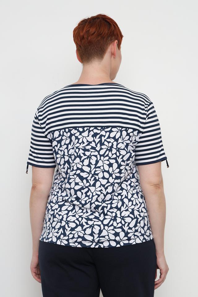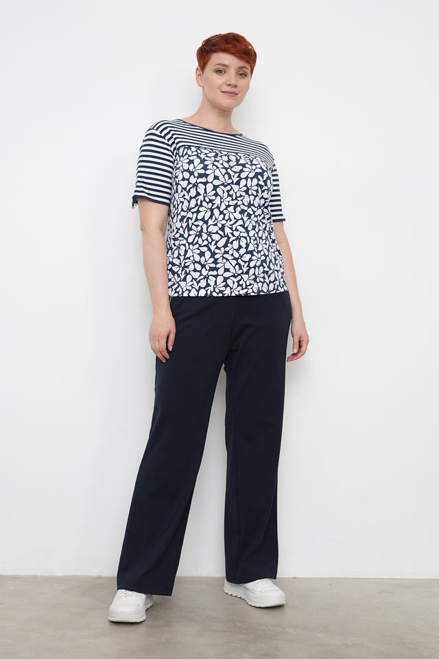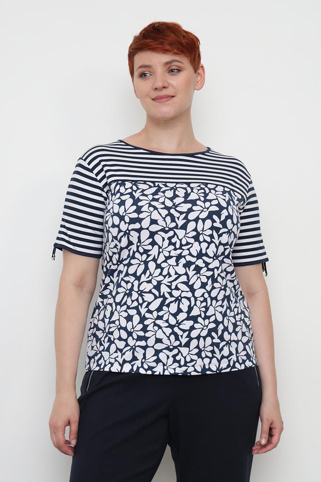 Женская футболка Rabe collection синего цвета с цветочным принтом и полосатой отделкой. Модель выполнена из мягкой вискозы с добавлением эластана для комфорта и хорошей посадки. Состав: вискоза 95%, эластан 5%