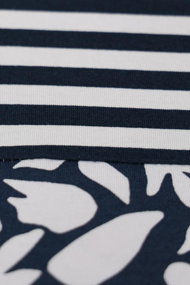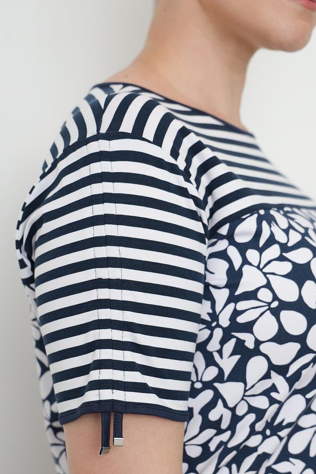 Футболка выполнена из высококачественной вискозы (95%) с добавлением эластана (5%), что обеспечивает приятные тактильные ощущения и хорошую посадку по фигуре. Верхняя часть футболки украшена ярким цветочным принтом, а нижняя часть выполнена в классическую сине-белую полоску.