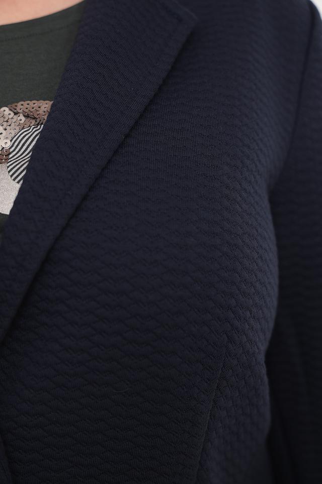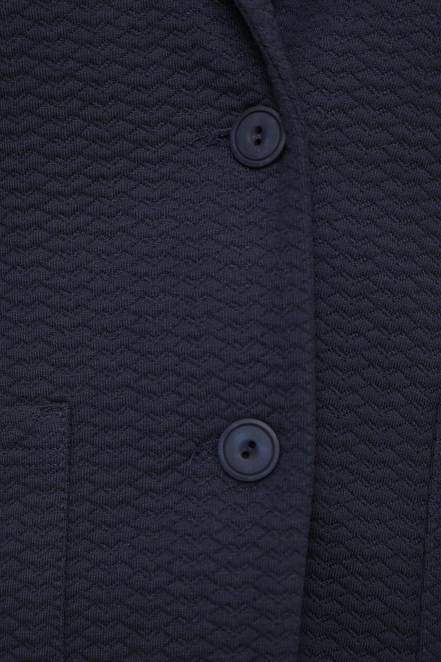 Жакет имеет классический крой с лацканами, застегивается на одну пуговицу. Два функциональных кармана добавляют практичности. Текстурированная ткань придает жакету интересный вид и приятные тактильные ощущения.