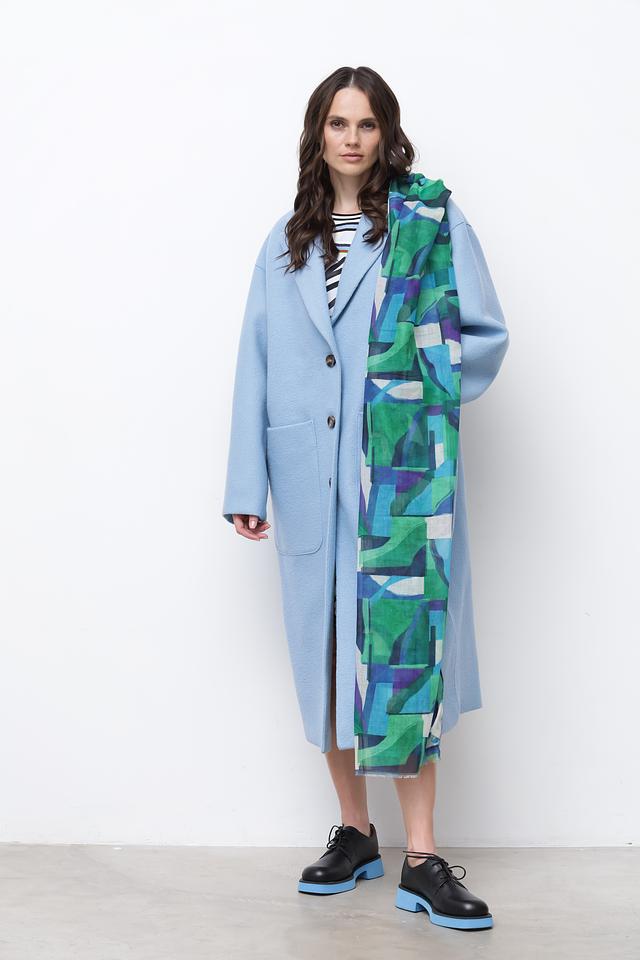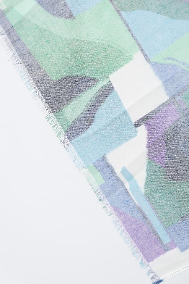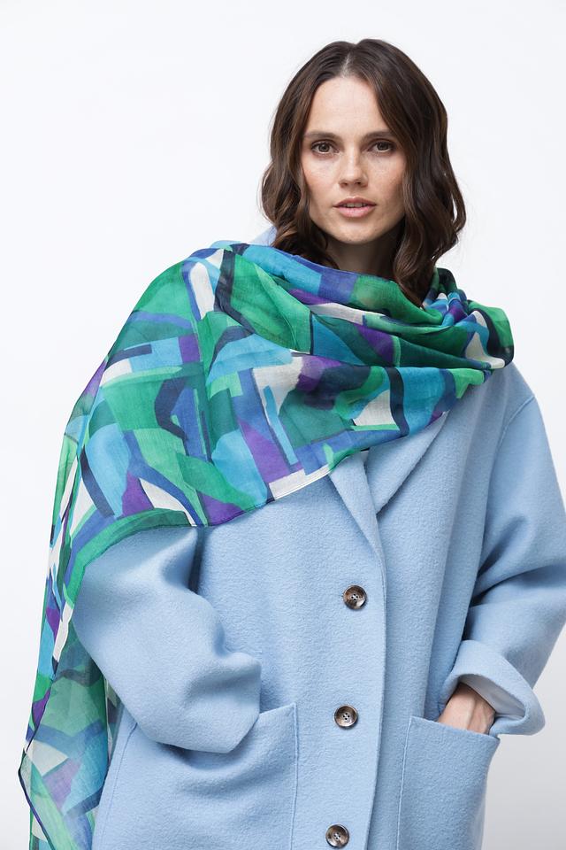 Этот стильный шарф от Rabe collection – идеальный аксессуар для создания неповторимого образа. Шарф выполнен в яркой цветовой гамме с абстрактным геометрическим принтом, сочетающим в себе оттенки зеленого, синего и фиолетового.