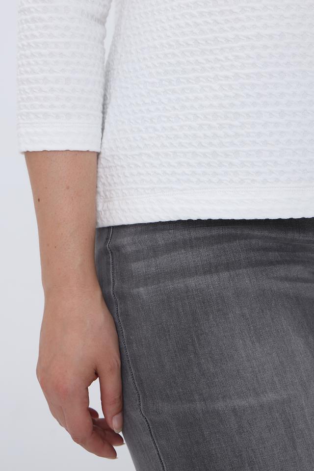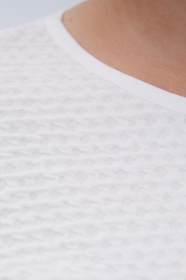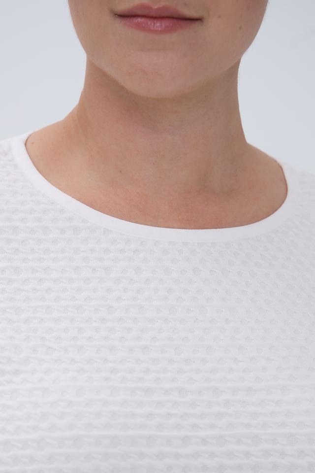 Этот пуловер от Rabe collection выполнен в белом цвете и отличается оригинальной текстурой, создающей объёмный эффект. Модель имеет классический крой с округлым вырезом горловины и рукавами три четверти.