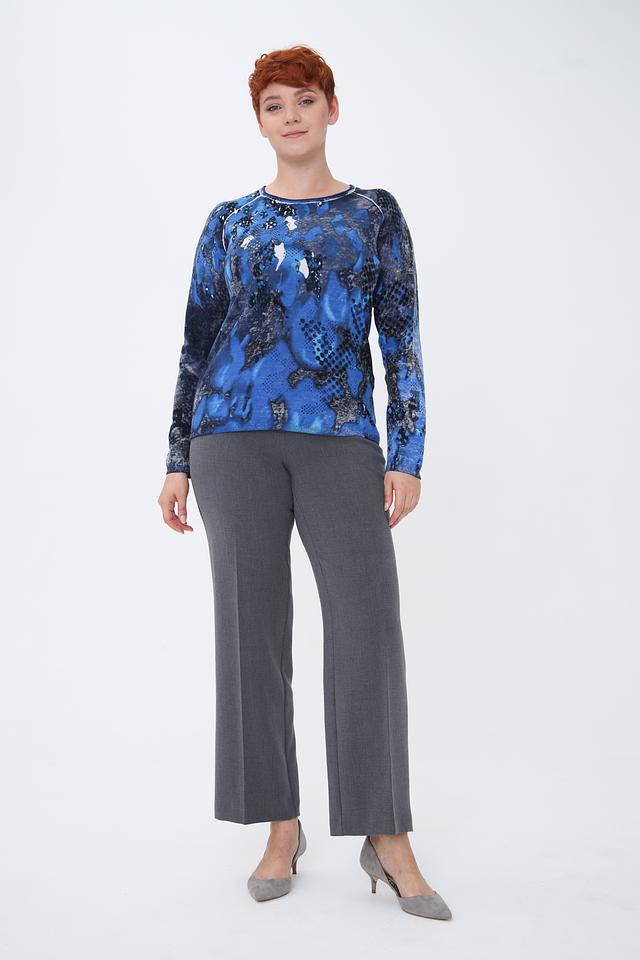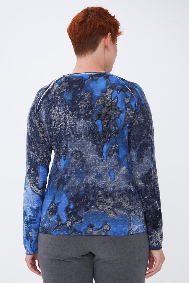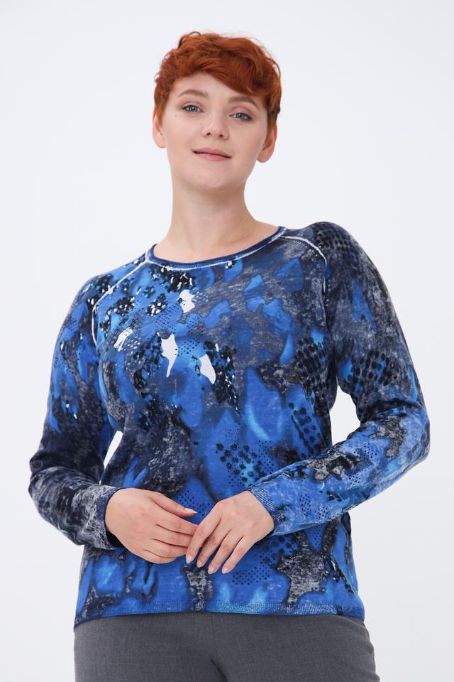 Модель отличается ярким и необычным дизайном – абстрактным принтом в синих и серых тонах. Круглый вырез горловины и длинные рукава создают классический силуэт, который легко сочетается с различными элементами гардероба.