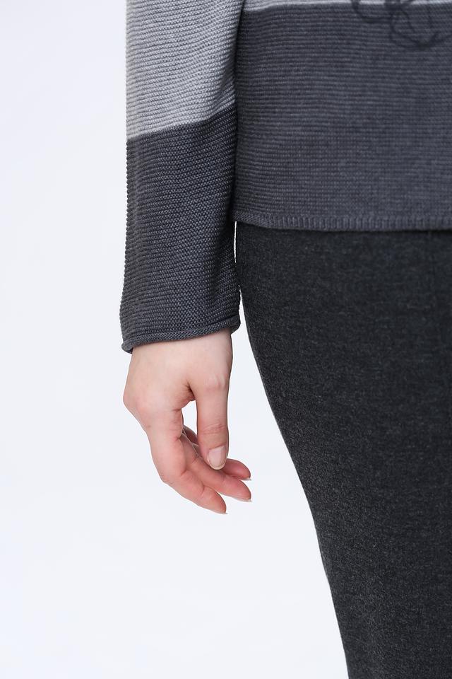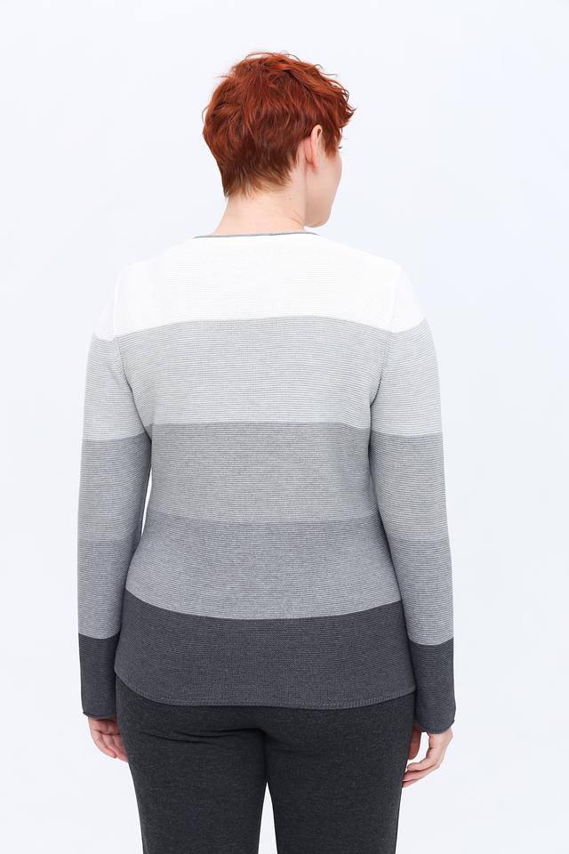Пуловер имеет длинные рукава и круглый вырез горловины, отделанный тонкой серой полоской. Градиентный переход цвета от белого к серому и графитовому добавляет изделию визуальный интерес.