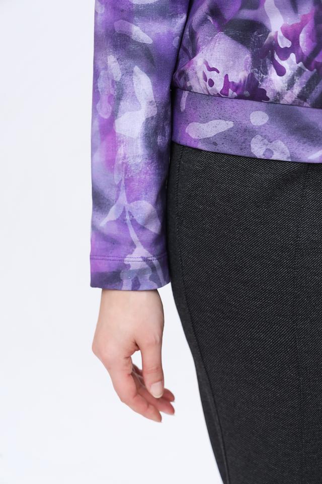 Лонгслив имеет приталенный силуэт и длинные рукава, что делает его универсальным для различных образов. Фиолетовый цвет с ярким цветочным принтом придаёт изделию неповторимый вид. Декоративная отделка стразами добавляет изысканности и привлекает внимание.