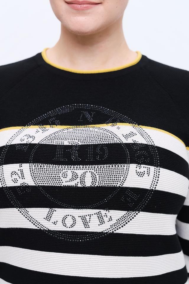 Основной цвет изделия – чёрный, дополненный широкими белыми полосами. На передней части пуловера расположена декоративная аппликация с изображением надписи “LOVE” и другими элементами, выполненная в золотистом цвете.