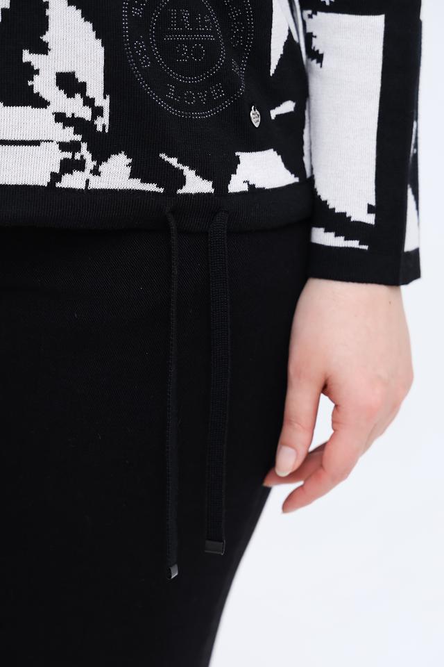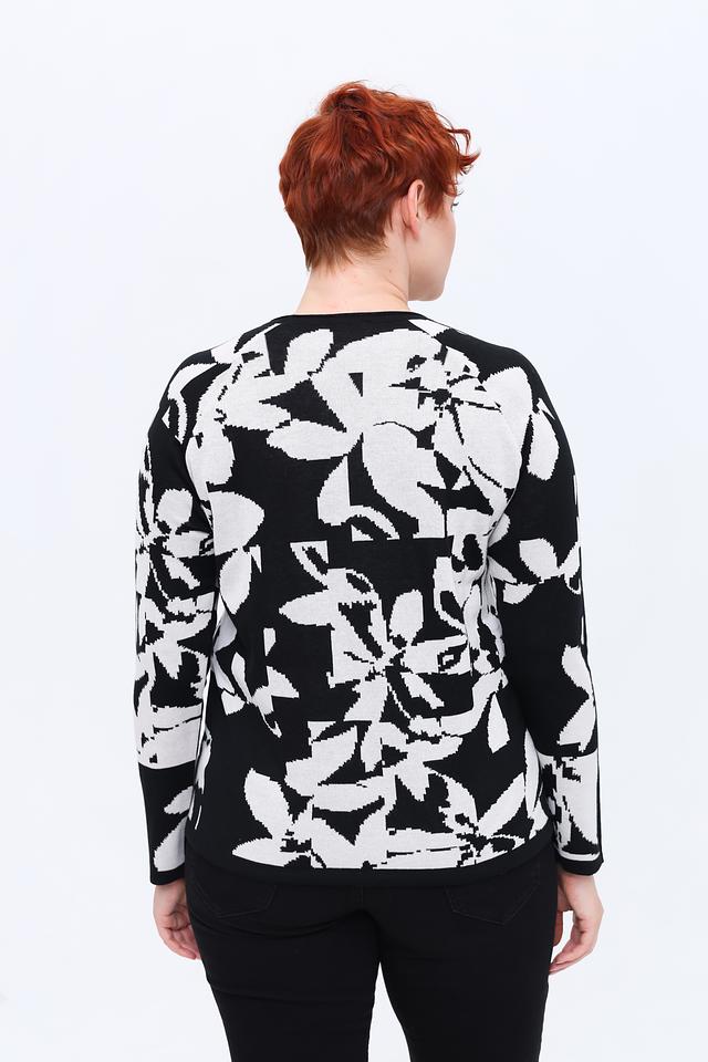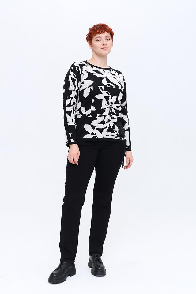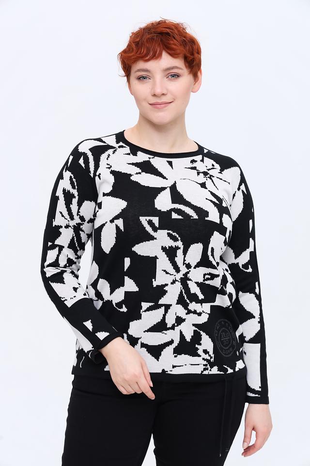 Основной цвет пуловера – чёрный, а ярким акцентом является крупный белый цветочный принт, который придает изделию свежий и женственный вид. Пуловер имеет слегка свободный силуэт, который не сковывает движений и обеспечивает комфортную посадку по фигуре.