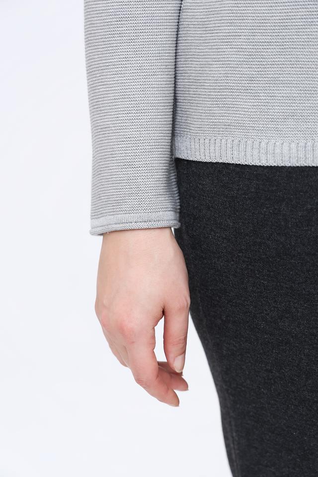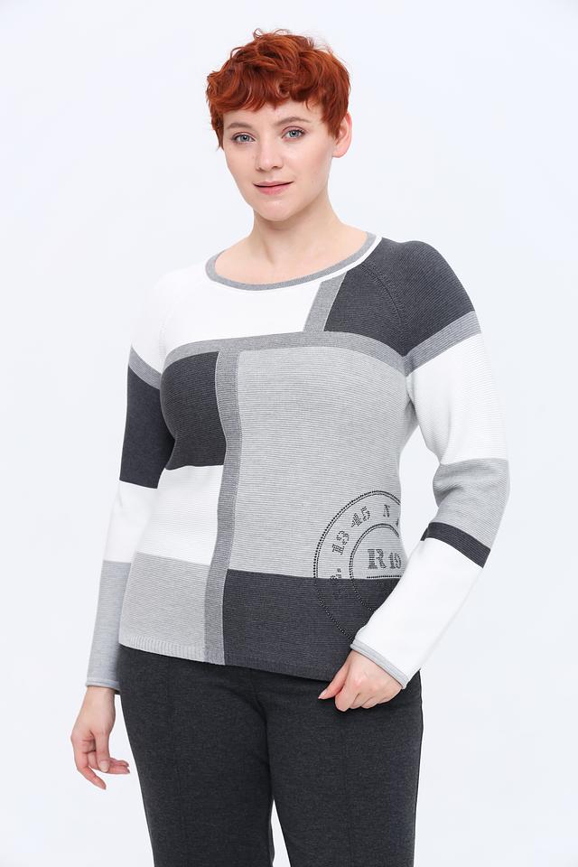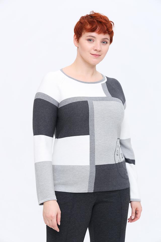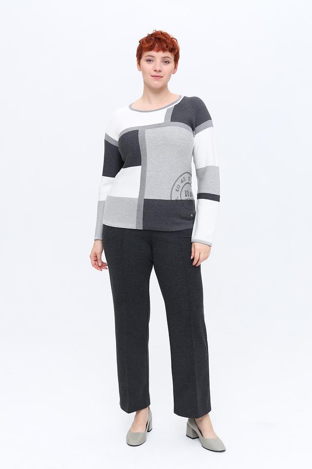 Дизайн пуловера выполнен в виде геометрического рисунка – крупной клетки, сочетающей в себе белый, серый и графитовый цвета. Такое сочетание делает его универсальным и легко сочетаемым с различными элементами гардероба.
