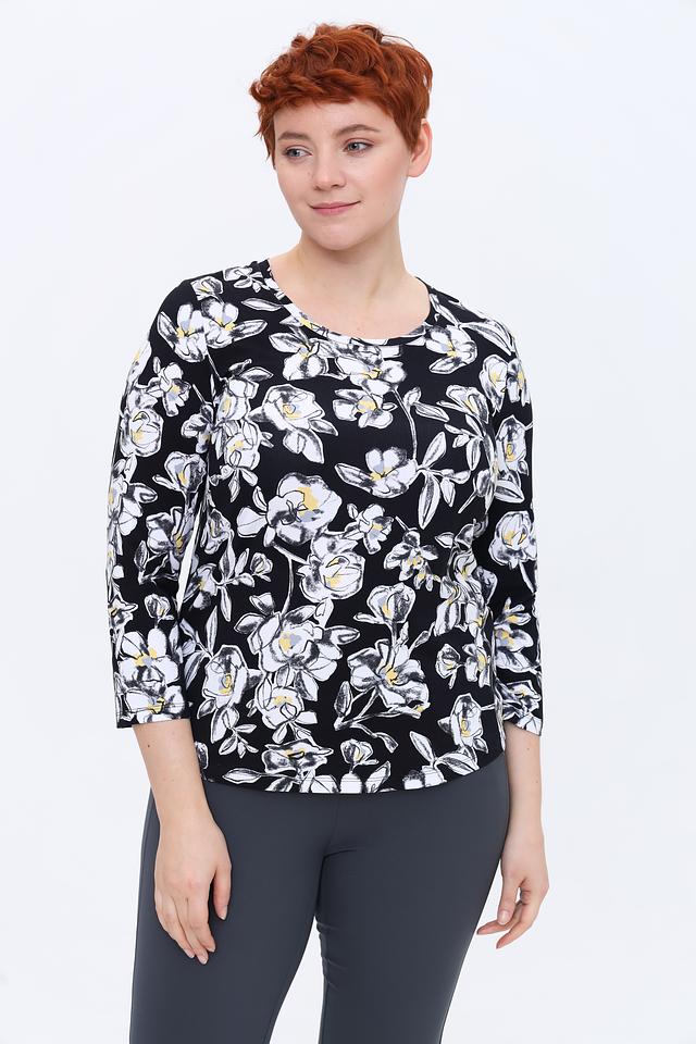 Эта стильная блуза от Rabe collection выполнена в чёрном цвете и украшена крупным цветочным принтом, состоящим из белых, жёлтых и серых оттенков. Блуза имеет округлый вырез горловины и короткие рукава 3/4, что делает её идеальным выбором для тёплой погоды.