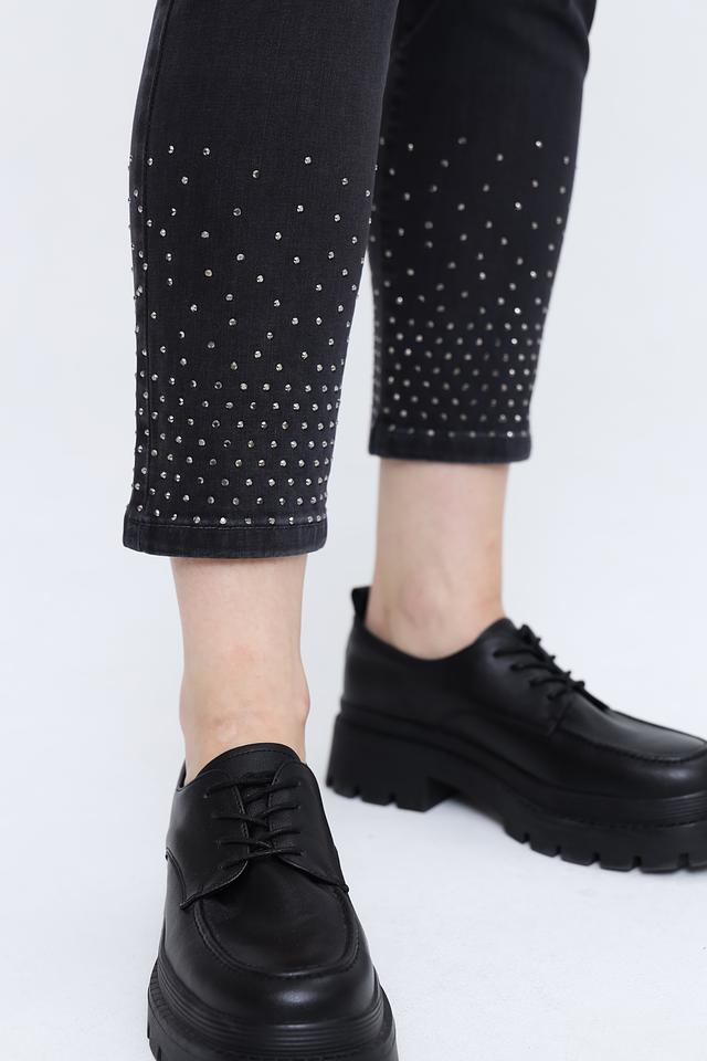 Особенностью данной модели является декор в виде страз, расположенных на штанинах. Этот элемент придает джинсам изысканность и делает их идеальным выбором для создания модных образов. Джинсы имеют стандартную посадку, удобный пояс и функциональные карманы.