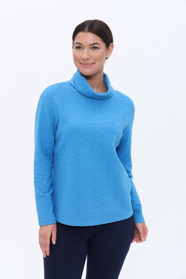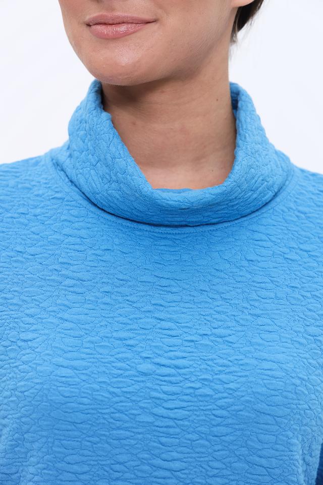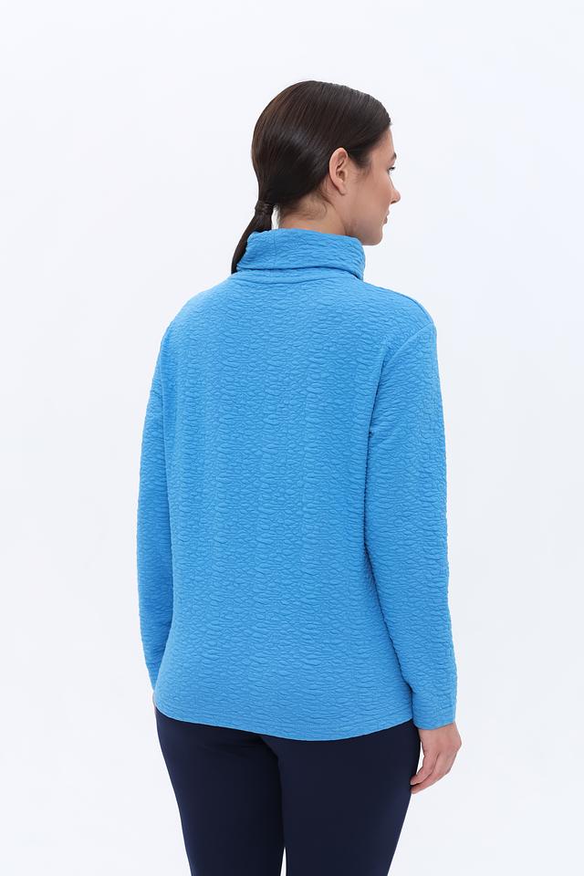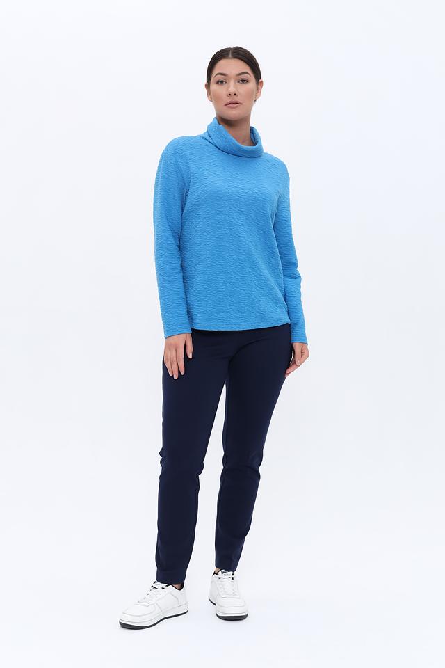 Пуловер имеет приятный голубой цвет и оригинальную текстуру, которая придает ему особый шарм. Высокий воротник-стойка не только согревает в прохладную погоду, но и добавляет элегантности образу.