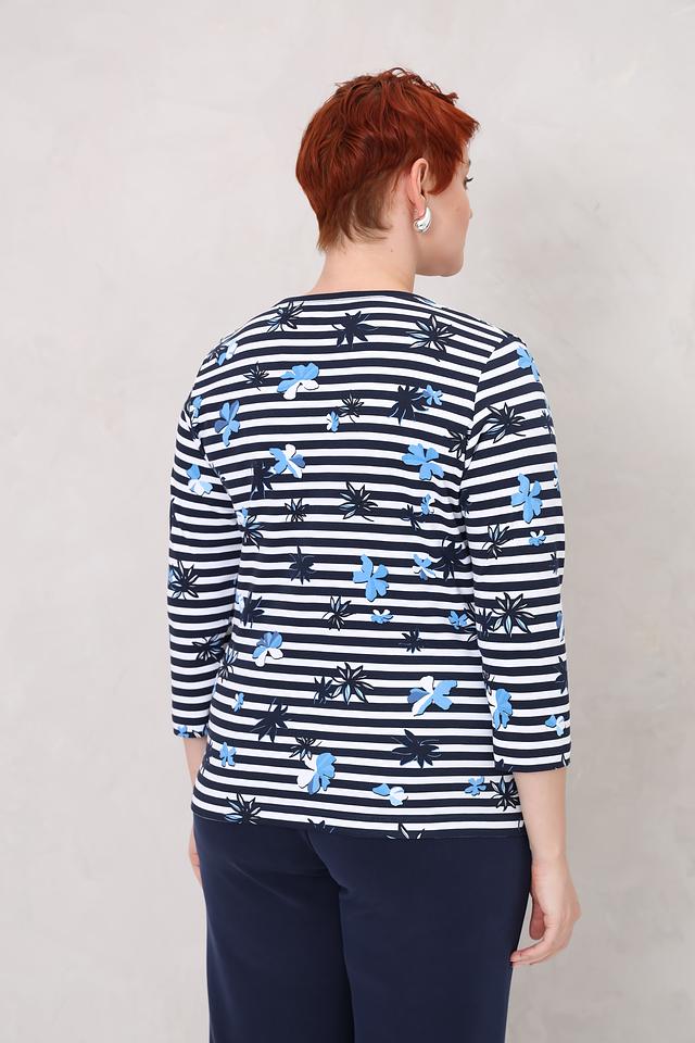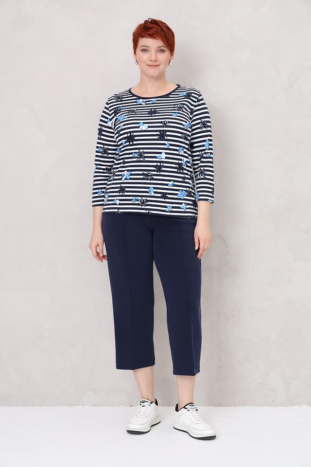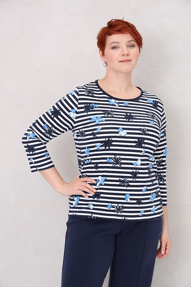 Женский лонгслив Rabe collection синего цвета с ярким цветочным принтом. Модель выполнена в полоску и имеет рукав 3/4, что делает ее универсальным дополнением к гардеробу. Состав: хлопок 100%