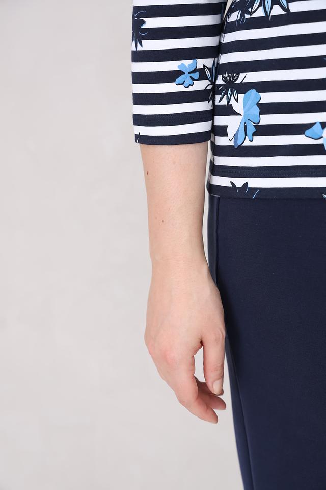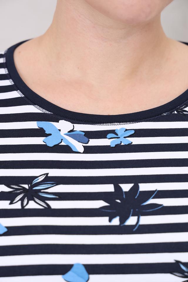 Лонгслив имеет классический крой с круглым вырезом горловины и рукавом три четверти. Основной цвет изделия – синий, дополненный белыми полосами и нежным цветочным принтом в голубых и синих тонах. Такой рисунок добавляет легкости и свежести образу.