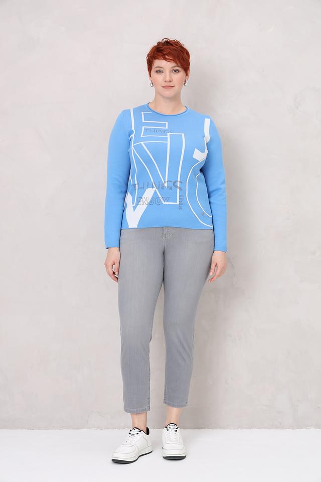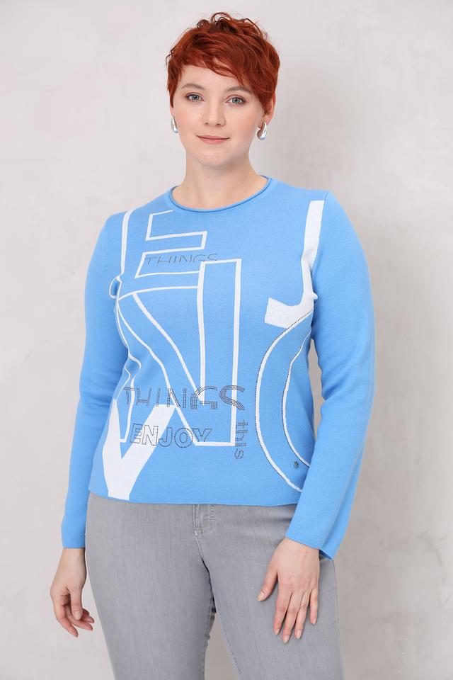 Этот стильный пуловер от Rabe collection выполнен в нежном голубом цвете и украшен современным геометрическим принтом с надписями. Модель имеет классический крой с длинными рукавами и круглым вырезом горловины, что делает его универсальным для различных образов.