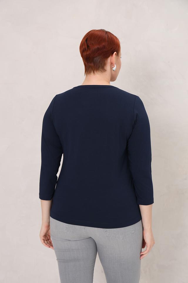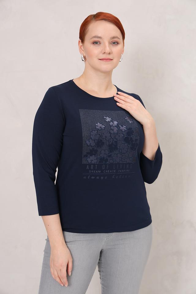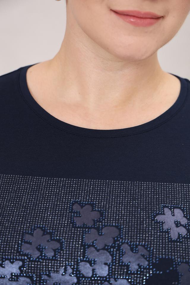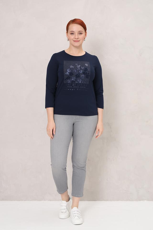 Лонгслив имеет классический крой с длинными рукавами и круглым вырезом горловины. Основной цвет – тёмно-синий, который легко сочетается с другими элементами одежды. Передняя часть украшена оригинальным цветочным принтом, выполненным в серо-синих тонах, добавляющим образу женственности и изысканности.