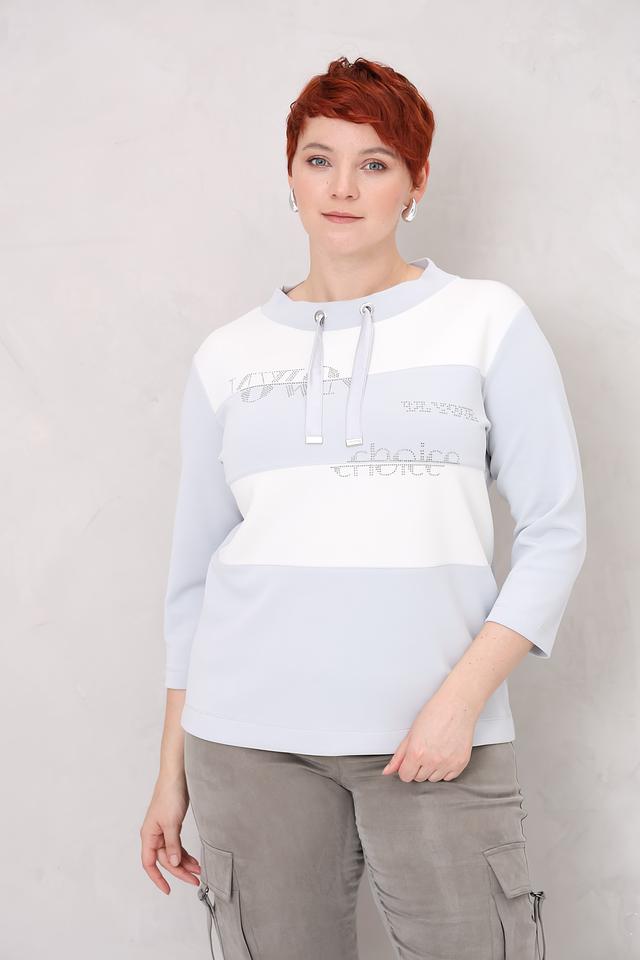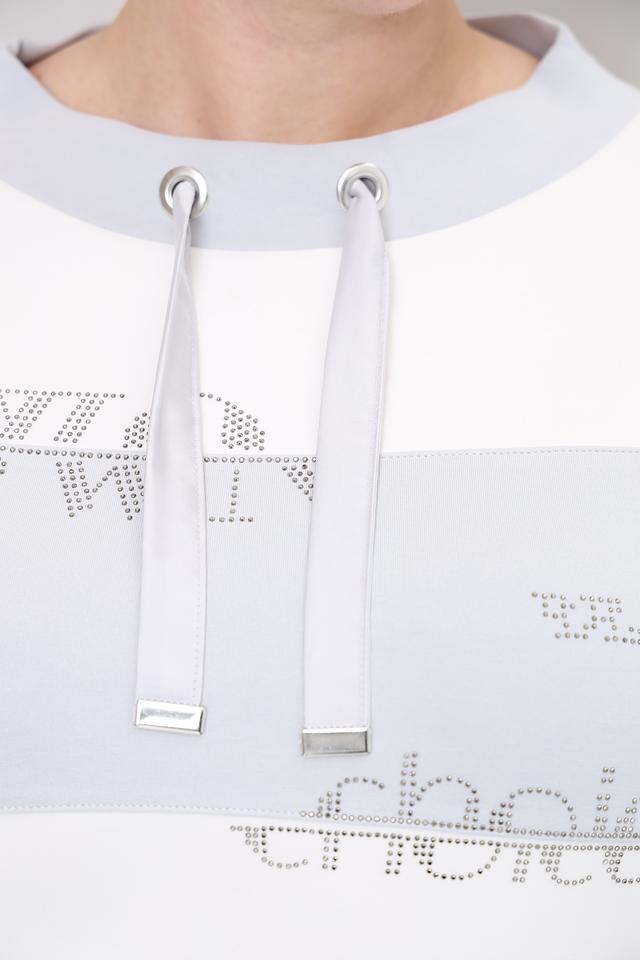 Модель отличается оригинальным дизайном: верхняя часть пуловера выполнена в белом цвете с декоративной надписью, украшенной стразами. Дополнительный акцент – капюшон с тонкими шнурками.