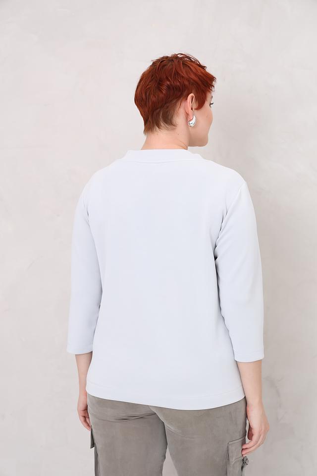 Пуловер изготовлен из высококачественного трикотажа, в составе которого 48% модал, 47% полиэстер и 5% эластан. Это сочетание обеспечивает комфорт в носке, мягкость и приятные тактильные ощущения. Рукава 3/4 делают этот пуловер универсальным для любого времени года.