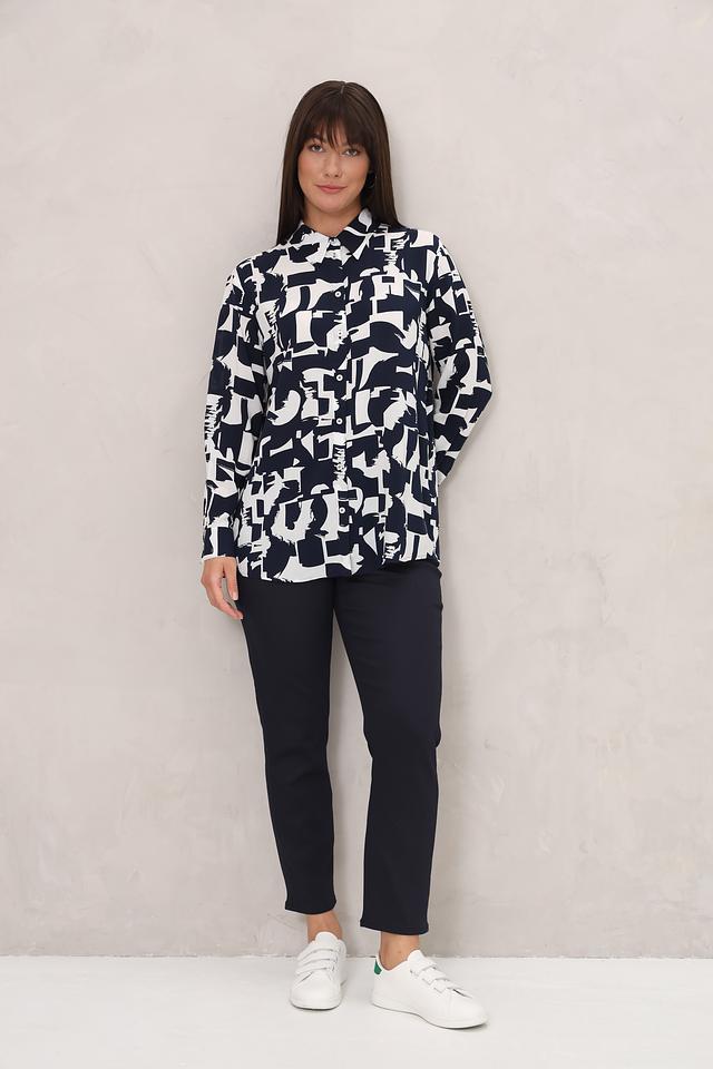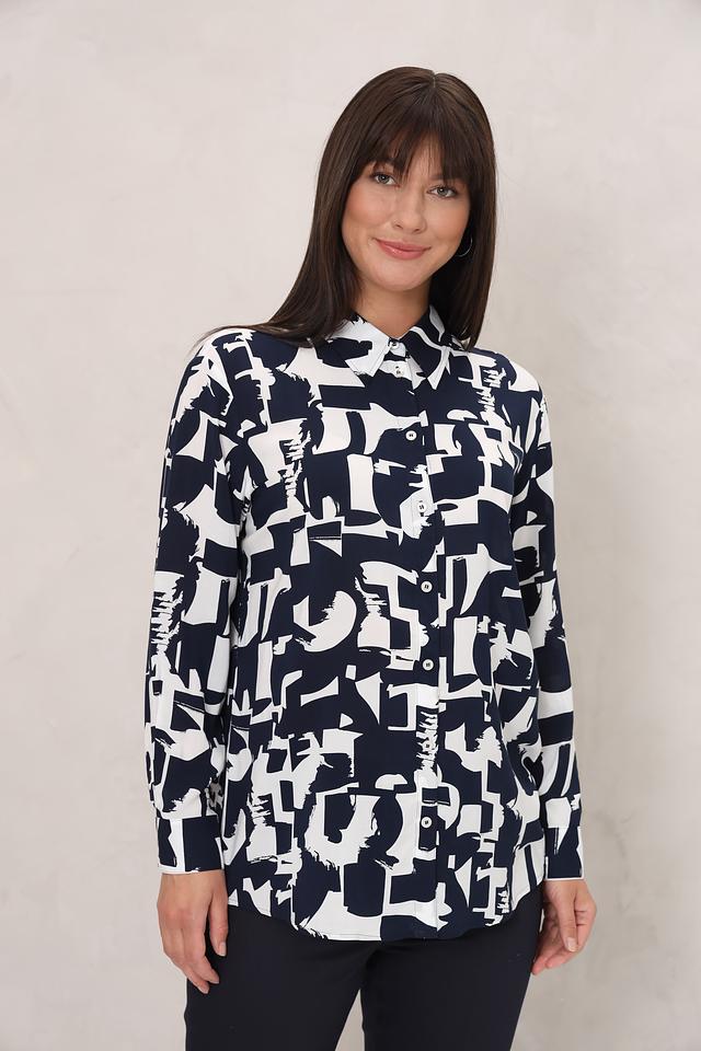 Рубашка Rabe collection темно-синего цвета с оригинальным абстрактным принтом станет стильным дополнением к вашему гардеробу. Модель выполнена из мягкой вискозы, обеспечивающей комфорт в носке. Состав: вискоза 100%