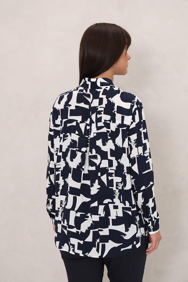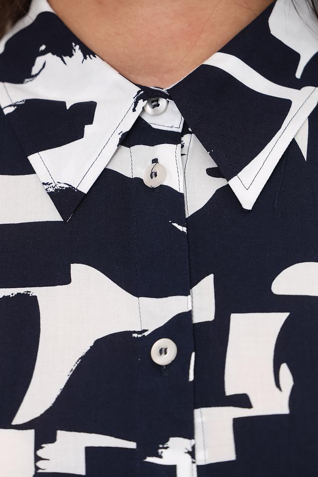 Рубашка имеет длинный рукав и классический крой с воротником. Особенностью модели является яркий абстрактный принт в бело-синей гамме, который добавляет ей индивидуальности. Застежка на пуговицы обеспечивает удобство надевания и снятия.