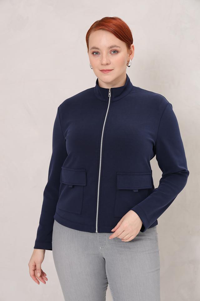 Жакет имеет два функциональных кармана на передней части, которые добавляют практичности. Воротник-стойка придает образу элегантность и сдержанность.