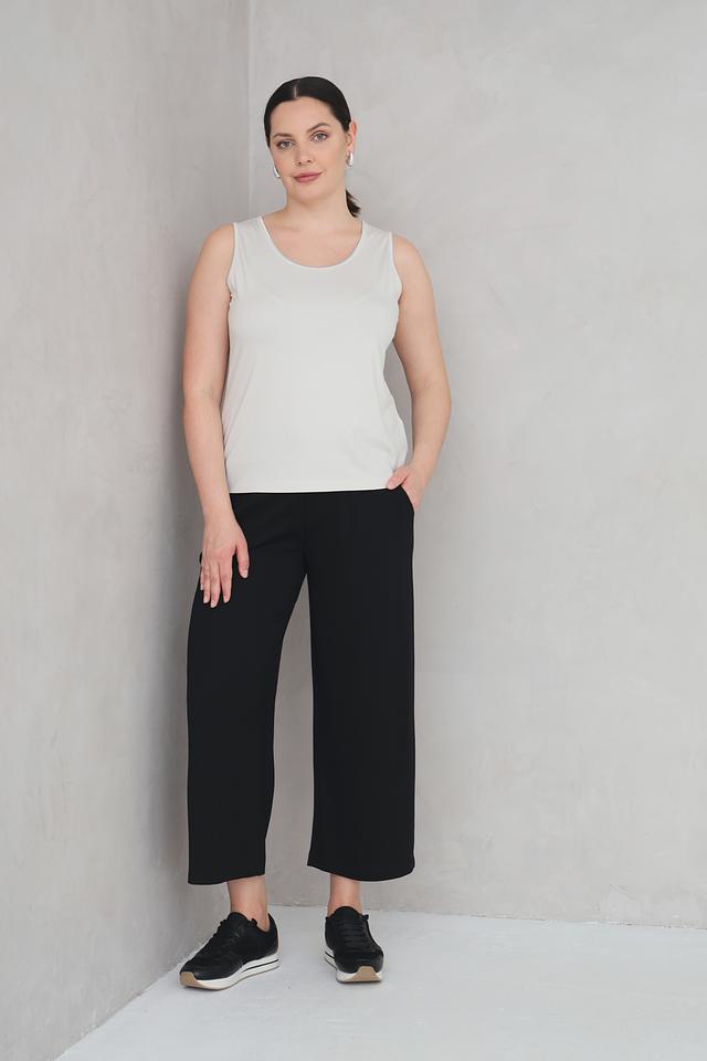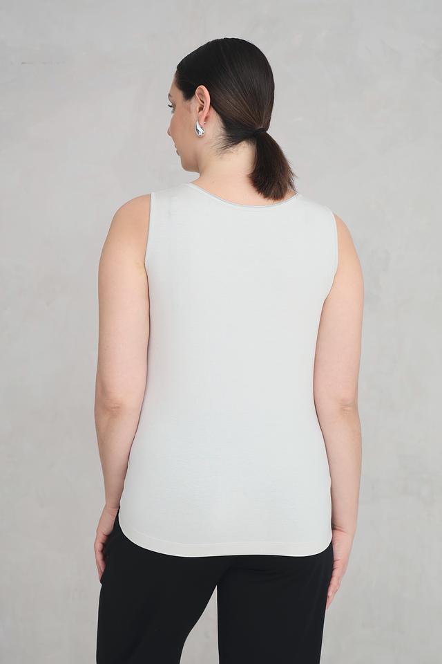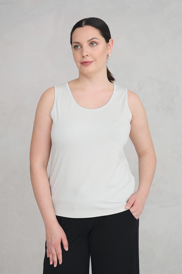 Топ имеет классический крой без рукавов и круглый вырез горловины. Он идеально подходит для создания многослойных образов или ношения в качестве самостоятельного элемента одежды.