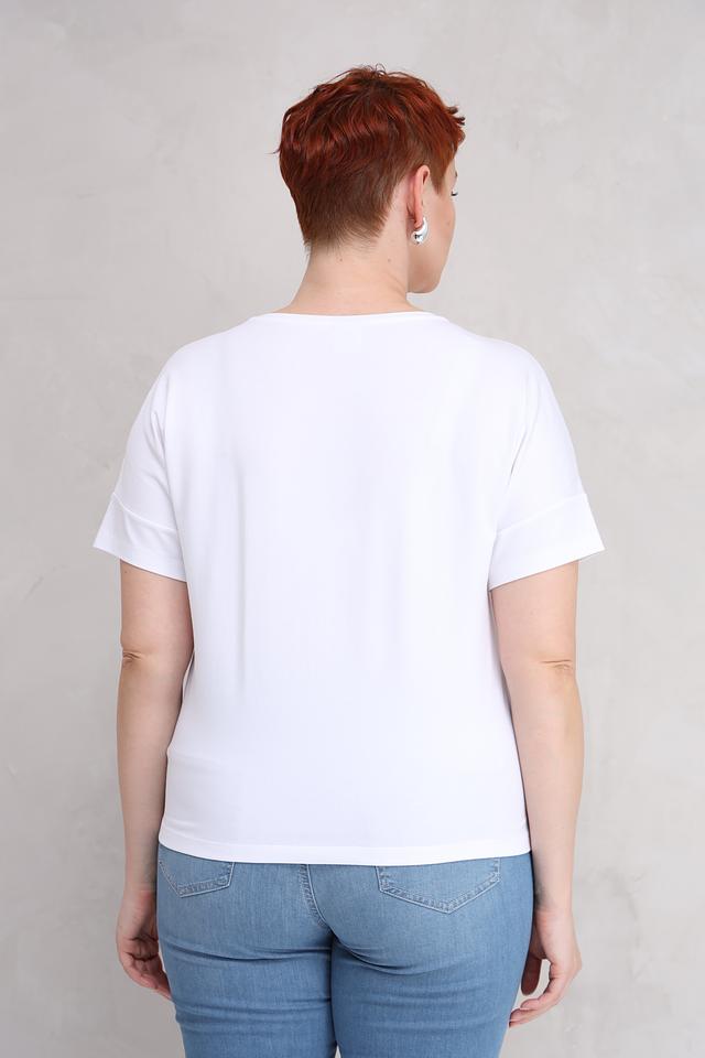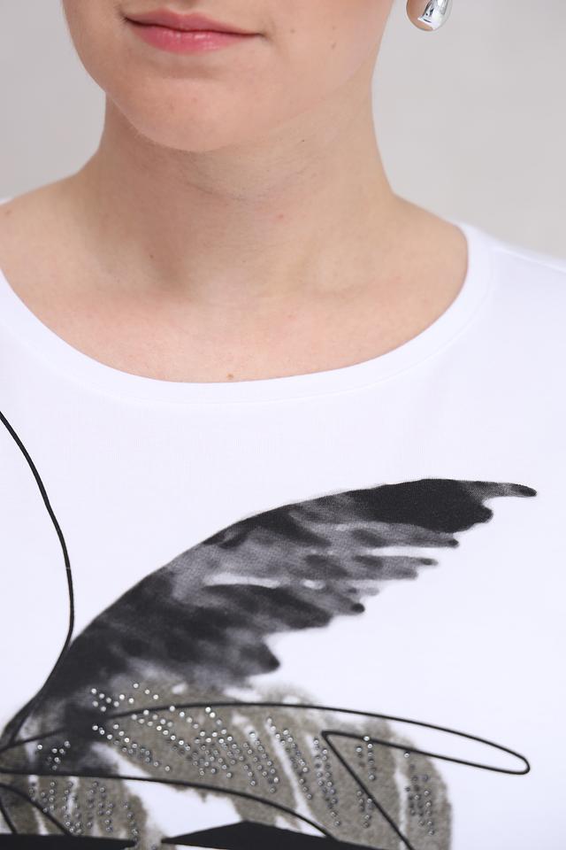 Основной цвет футболки – белый, что делает ее универсальной и легко сочетаемой с другими элементами одежды. Передняя часть украшена стильным принтом, изображающим листья в графитовых и серебристых тонах, добавляя образу изысканность.