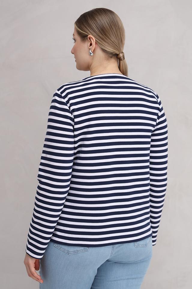 Этот жакет от Rabe collection станет отличным дополнением к вашему гардеробу. Модель выполнена в классической полосатой расцветке – сочетание синего и белого цветов всегда актуально и легко сочетается с другими вещами.