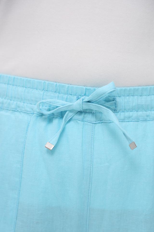 Женские брюки капри Rabe collection бирюзового цвета выполнены из натурального льна. Модель с заниженной талией и эластичным поясом на шнуровке, дополнена боковыми карманами. Состав: лен 100%
