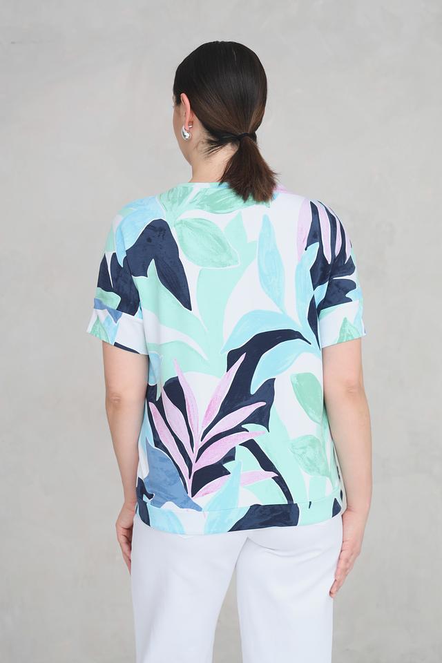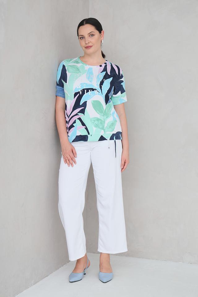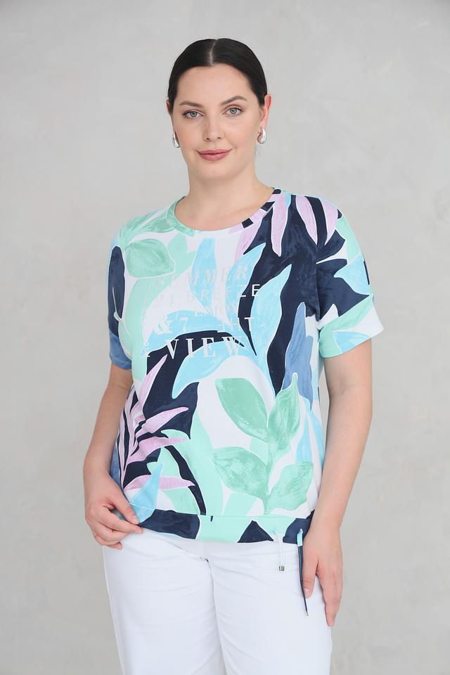 Эта стильная футболка от Rabe collection станет отличным дополнением к вашему гардеробу. Футболка выполнена в светло-зелёном цвете и украшена ярким принтом с изображением тропических листьев и цветов.