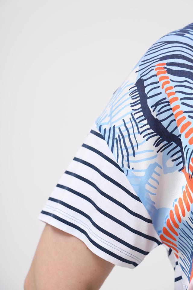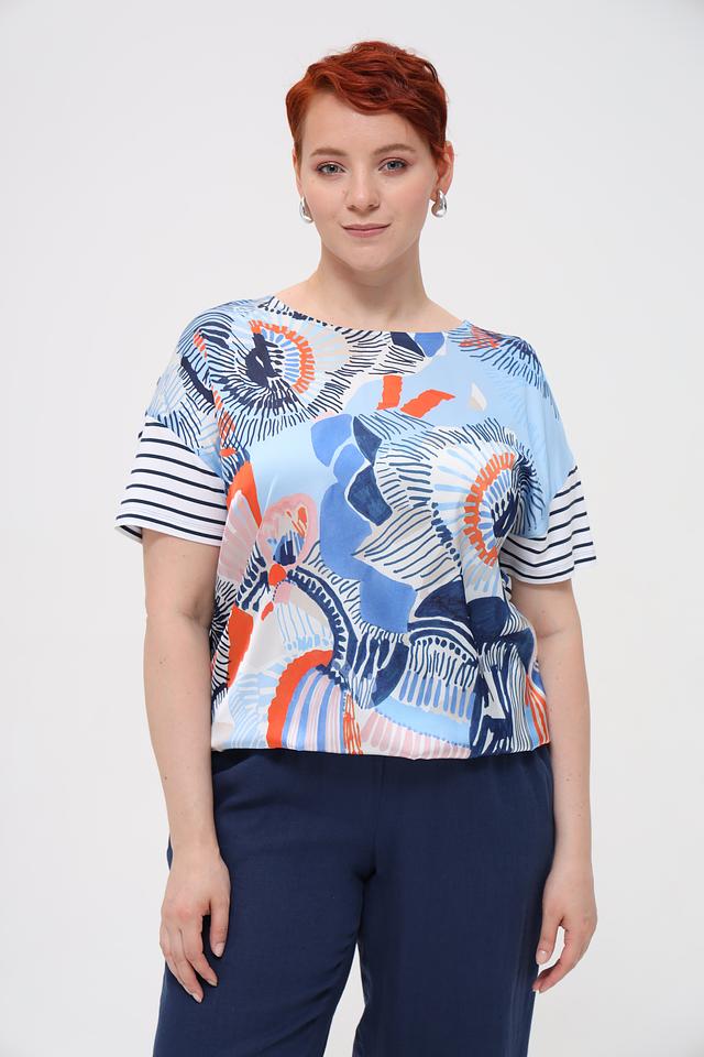 Эта стильная блуза от Rabe collection выполнена в нежном голубом цвете и украшена оригинальным цветочным принтом, сочетающим в себе оттенки синего, оранжевого и розового. Модель имеет свободный крой, короткие рукава и округлый вырез горловины, что делает её удобной и универсальной.