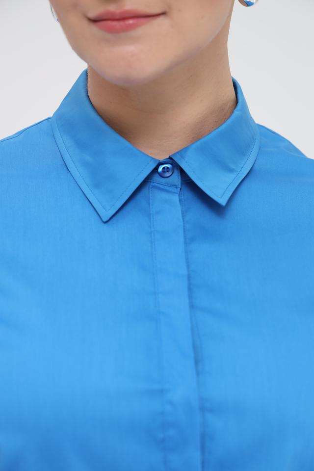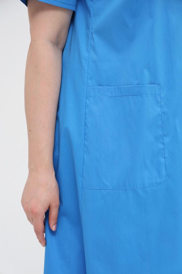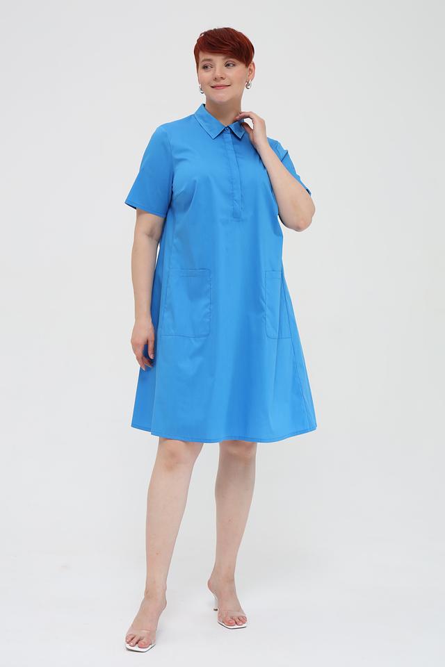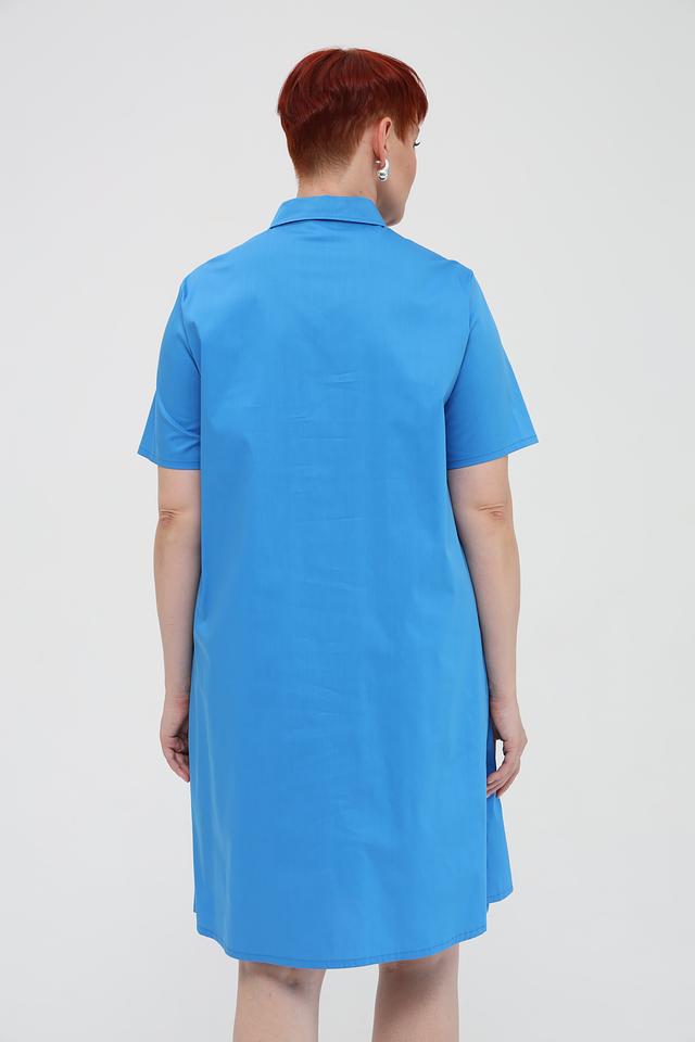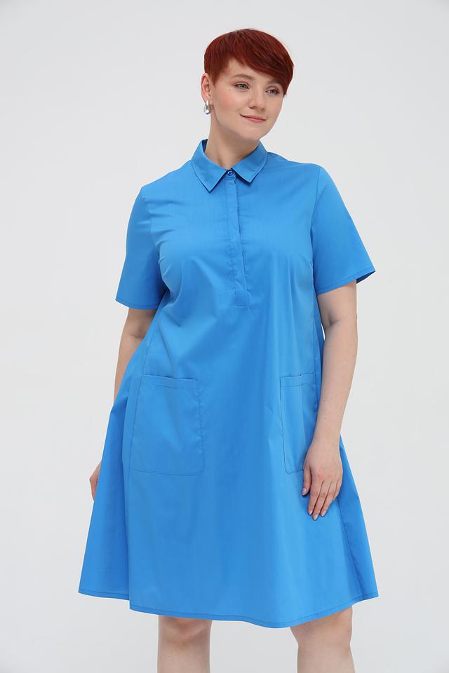 Платье с короткими рукавами и воротником-стойкой, застегивается на ряд пуговиц. На передней части платья расположены два накладных кармана, добавляющие практичности и непринужденности образу. Ткань платья – это сочетание хлопка, полиамида и эластана, что обеспечивает комфорт в носке, воздухопроницаемость и небольшую эластичность.