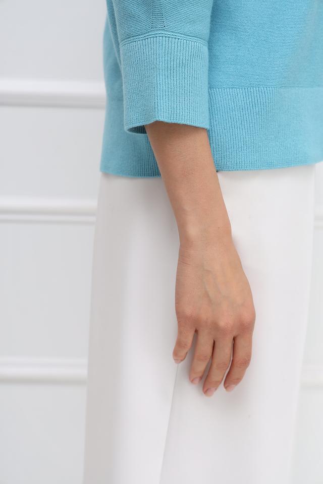 Пуловер имеет рукав три четверти и круглый вырез горловины, что придает ему классический и элегантный вид. Текстура трикотажа мягкая и приятная на ощупь, благодаря составу: 50% вискоза, 27% полиэстер и 23% полиамид. Такое сочетание материалов обеспечивает комфорт при носке и сохраняет форму изделия.