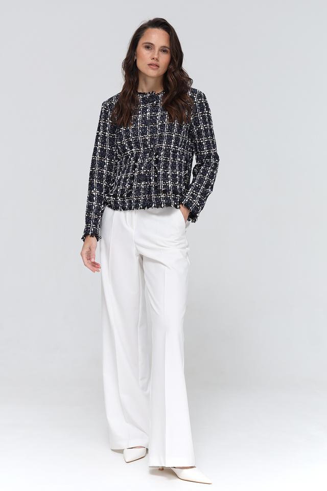 Жакет имеет приталенный силуэт, который подчеркивает фигуру. Застежка на пуговицы обеспечивает удобство ношения, а длинные рукава делают его подходящим для прохладной погоды. Отделка бахромой по краям добавляет оригинальности и шарма.