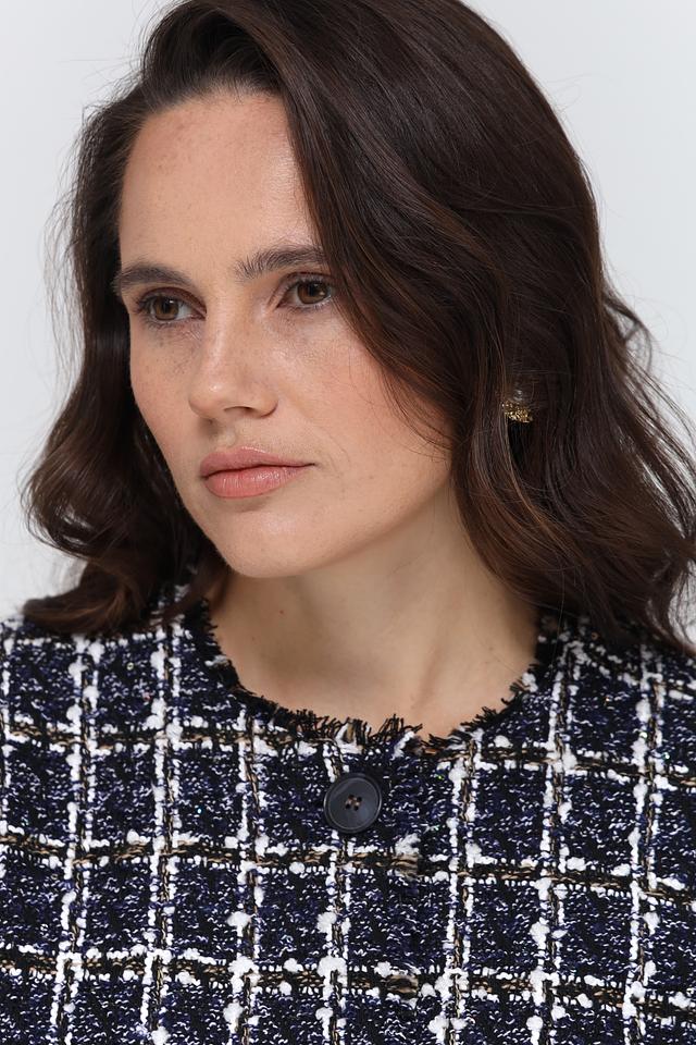 Этот жакет от Rabe collection станет прекрасным дополнением к вашему гардеробу. Выполненный в тёмно-синей цветовой гамме, он украшен классическим клетчатым принтом, который придает ему элегантный и утонченный вид.
