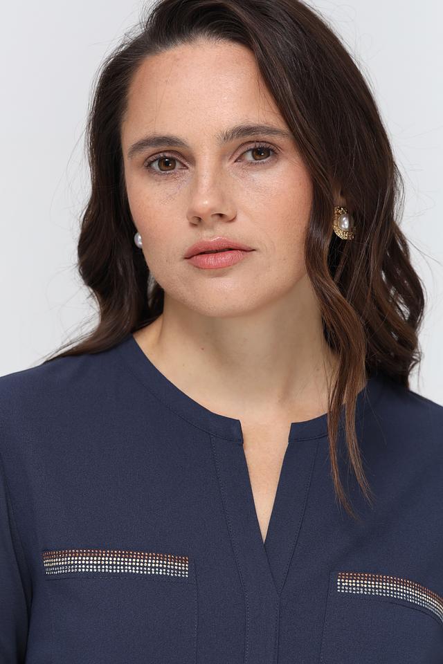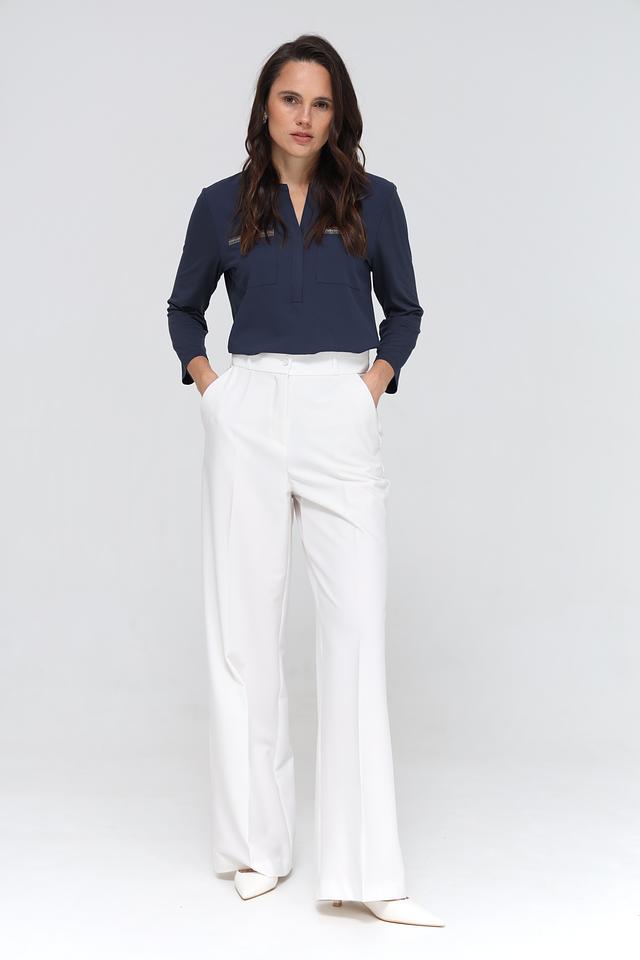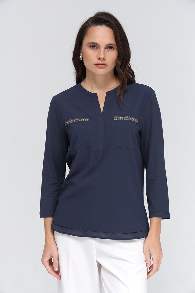 Модель имеет удобный V-образный вырез горловины и рукава длиной 3/4, что делает ее подходящей для любого времени года. На груди расположены два накладных кармана с декоративной отделкой, добавляющие блузе оригинальности.