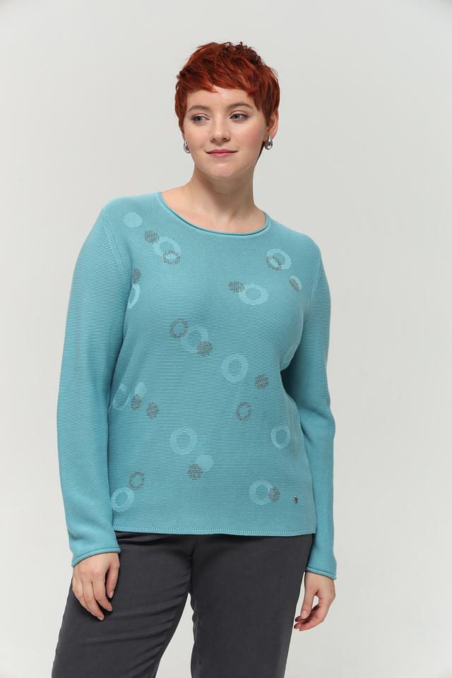 Этот стильный пуловер от Rabe collection станет прекрасным дополнением к вашему гардеробу. Пуловер выполнен в нежном бирюзовом цвете и украшен оригинальным узором из светло-серых кругов, что придает ему особый шарм.
