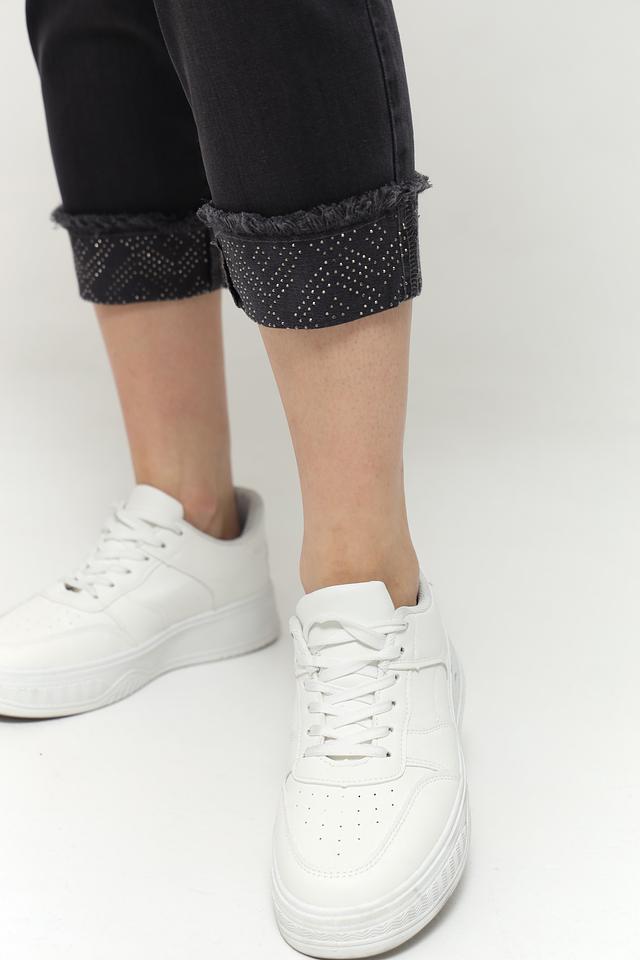 Особенностью данной модели является декоративная отделка в виде кружева на щиколотках, которая придает джинсам женственности и оригинальности. Классическая застежка на пуговицу и молнию обеспечивает надежную фиксацию. Джинсы прекрасно сочетаются с различными видами обуви и одежды, позволяя создавать разнообразные стильные образы.