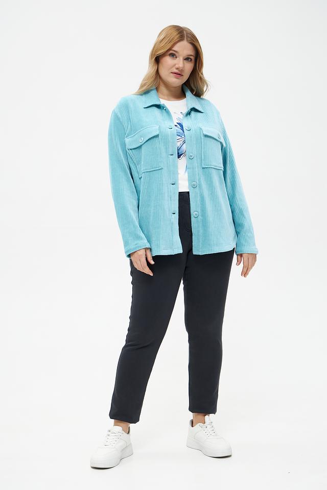 Жакет имеет прямой крой, воротник и застегивается на пуговицы в тон изделию. Два накладных кармана добавляют практичности и непринужденности образу. Вертикальная полоска вельвета визуально вытягивает силуэт.