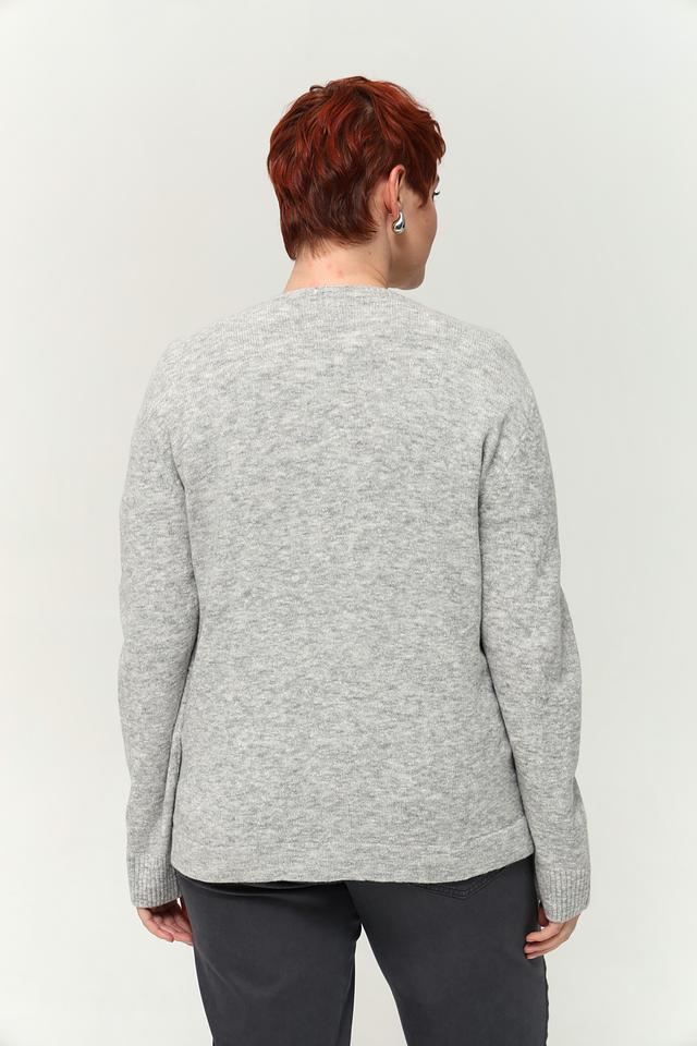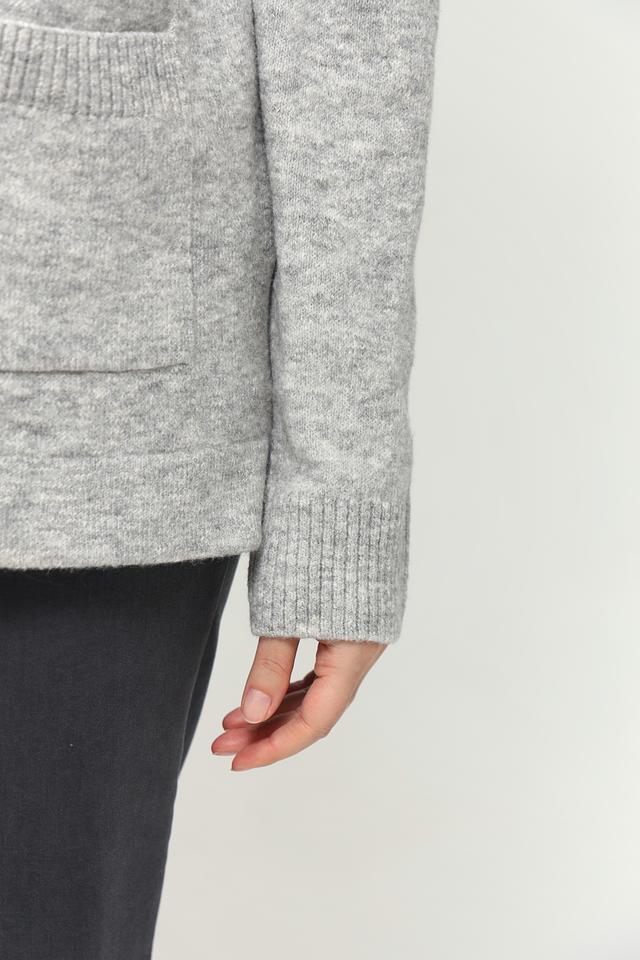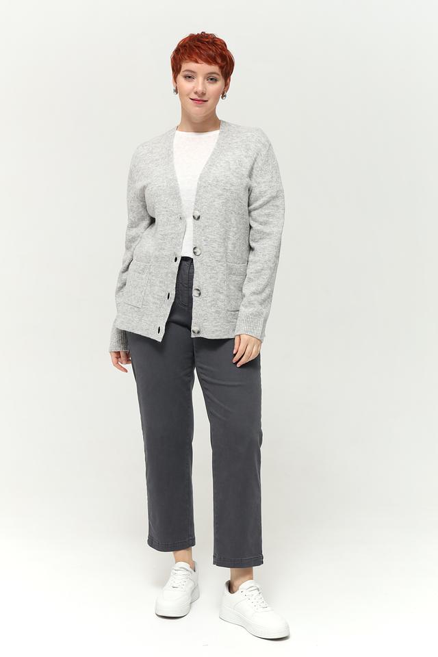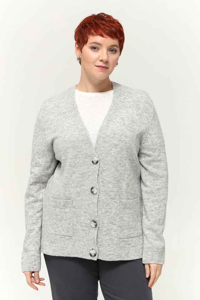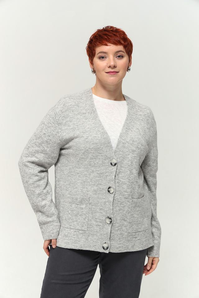 Жакет имеет V-образный вырез, длинные рукава и два накладных кармана. Застежка выполнена на пуговицы. Трикотажная структура вязки придает жакету уютный и непринужденный вид. Этот жакет идеально подойдет для создания повседневных образов.