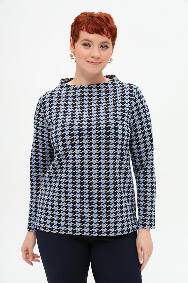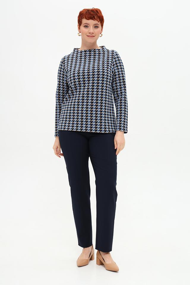 Женский пуловер Rabe collection голубого и тёмно-синего цвета с геометрическим принтом. Модель выполнена из мягкого и приятного к телу трикотажа, имеет округлый вырез горловины и длинные рукава. Состав: полиэстер 70%, вискоза 28%, эластан 2%