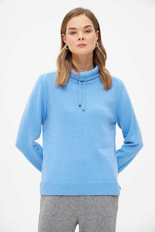Голубой пуловер от Rabe collection из мягкой смеси шерсти, полиамида и модала. Модель с воротником-стойкой и декоративными шнурками. Идеальный выбор для создания уютного и стильного образа. Состав: шерсть 50%, полиамид 30%, модал 20%