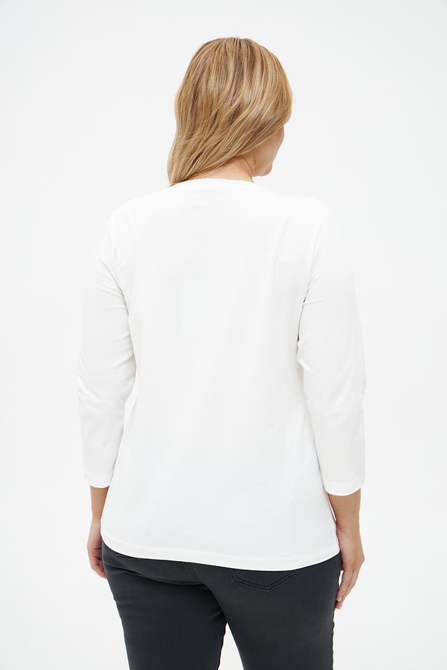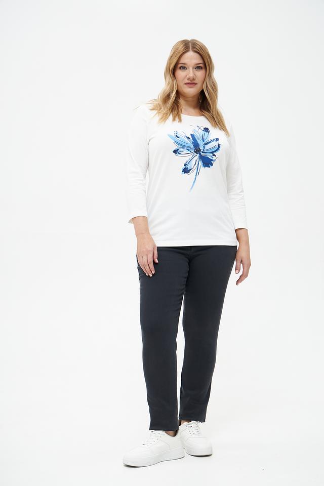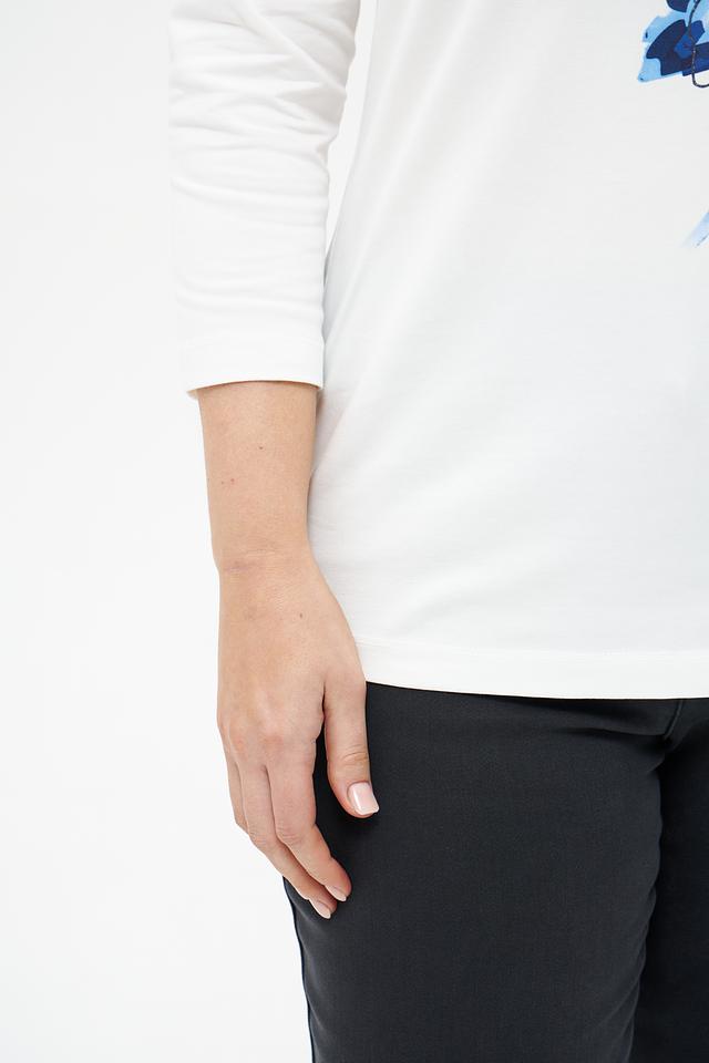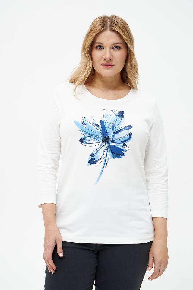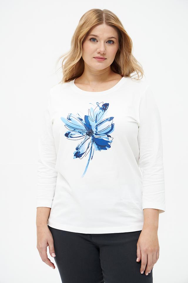 Эта стильная футболка от Rabe collection выполнена в белом цвете и украшена ярким цветочным принтом синих оттенков. Модель имеет прямой крой и удобную длину рукава 3/4, что делает ее универсальной для различных образов.