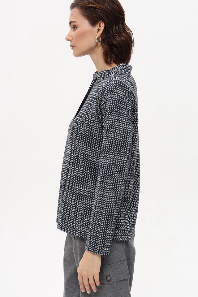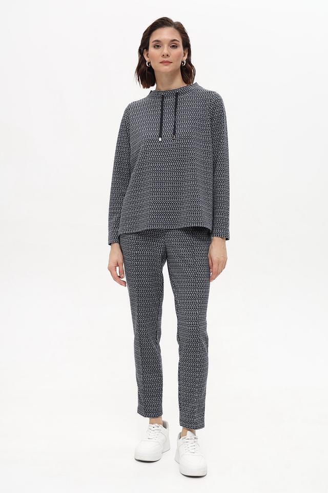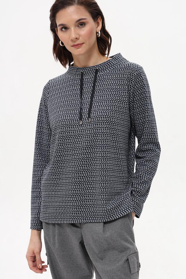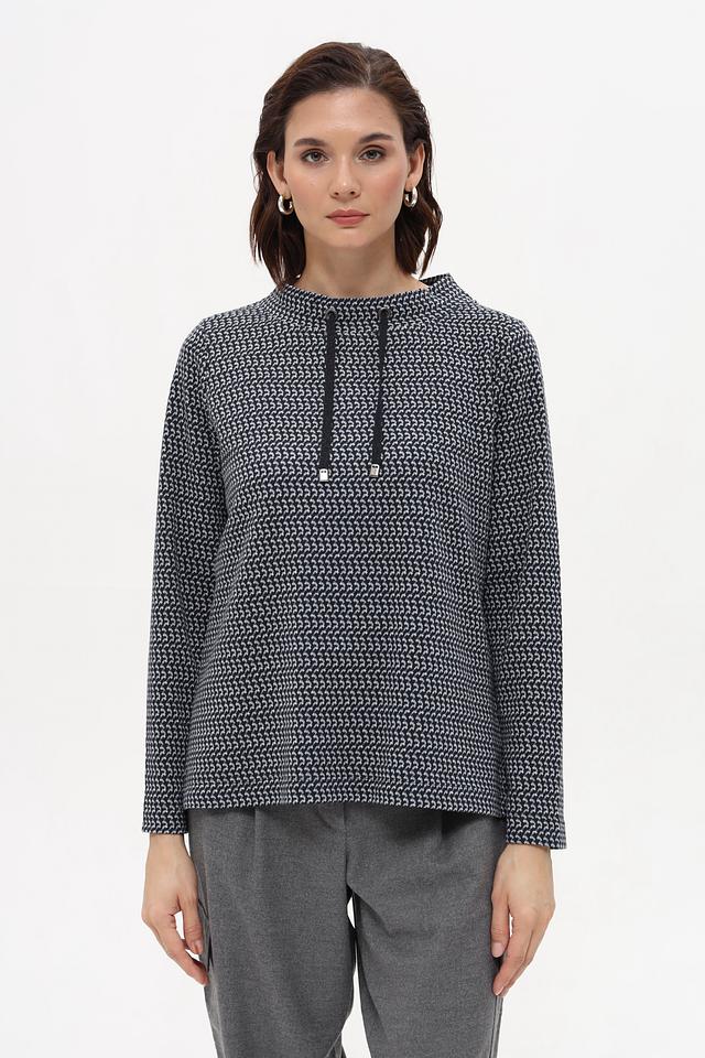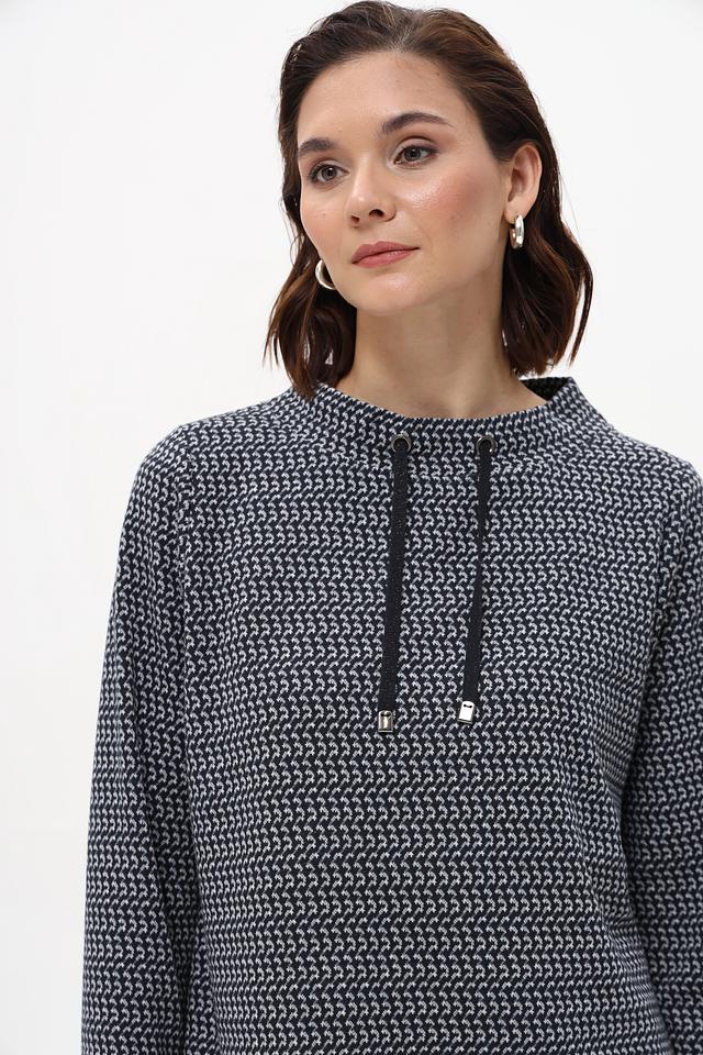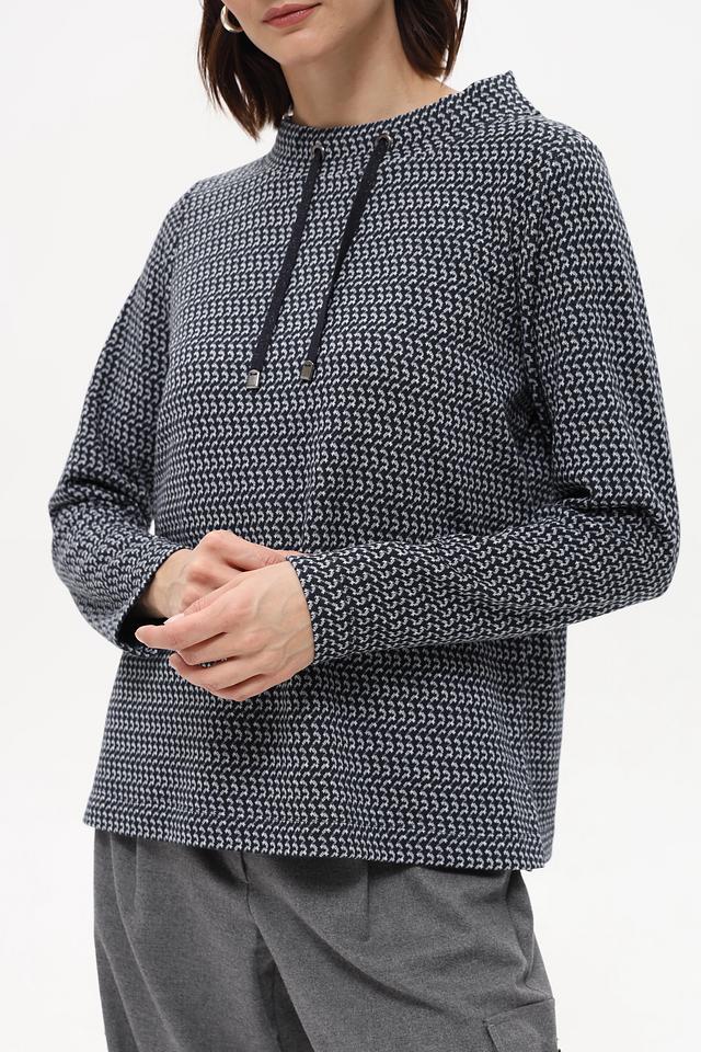 Пуловер имеет прямой крой и длинные рукава. Особенностью модели является оригинальный принт, который придает ей индивидуальность. Небольшой вырез горловины дополнен двумя шнурками, добавляющими образу динамичности.