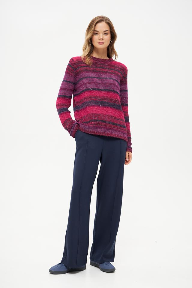 Этот стильный пуловер от Rabe collection выполнен в яркой цветовой гамме с полосатым узором. Преобладающий цвет – фуксия, который разбавлен более темными оттенками, создавая интересный визуальный эффект.
