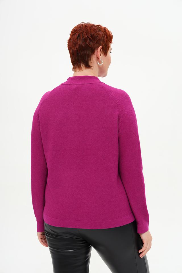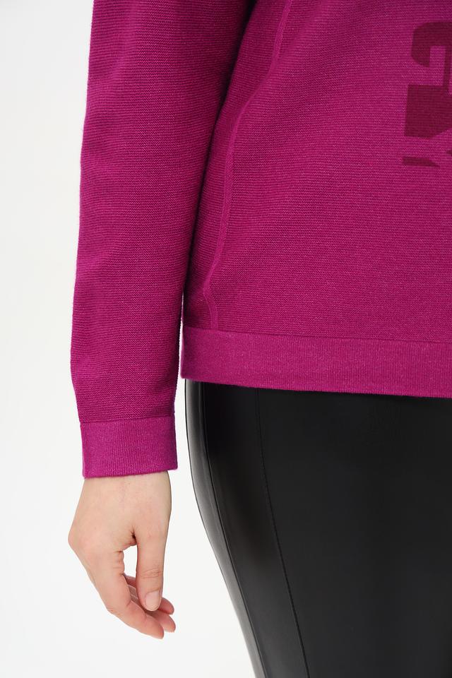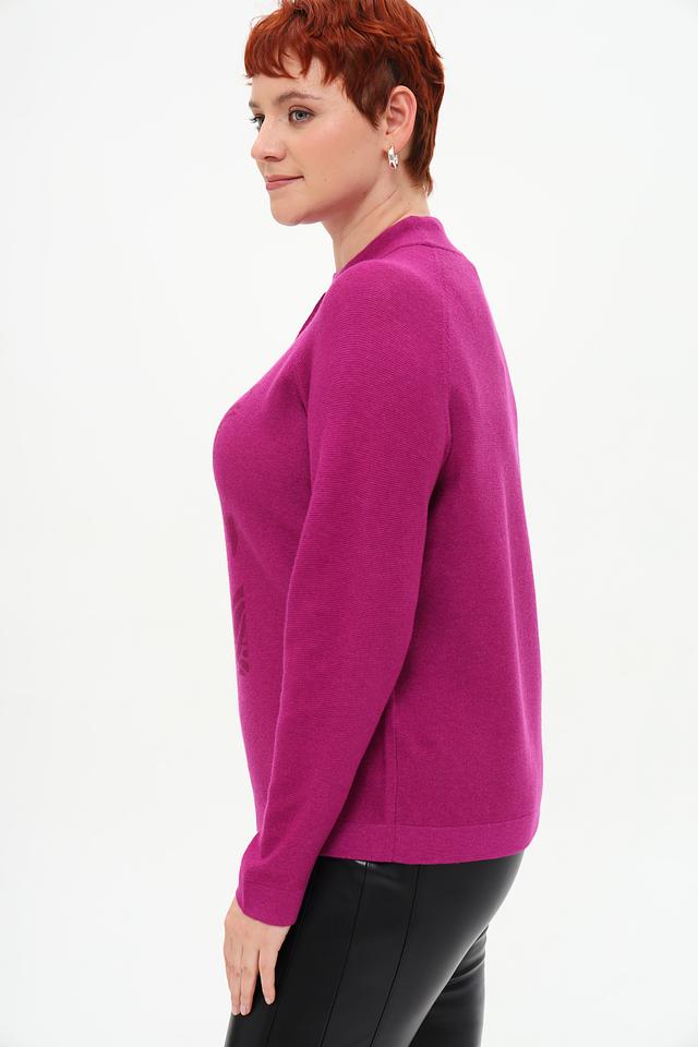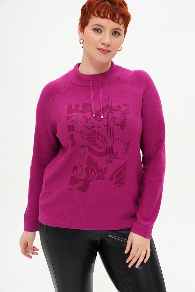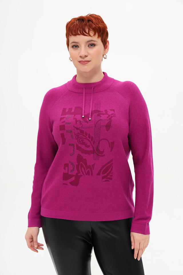 Пуловер украшен оригинальным принтом с изображением цветов и абстрактных элементов, выполненным в более темном оттенке фуксии. Высокий воротник-стойка добавляет элегантности, а небольшая петля на плече придает модели современный вид.
