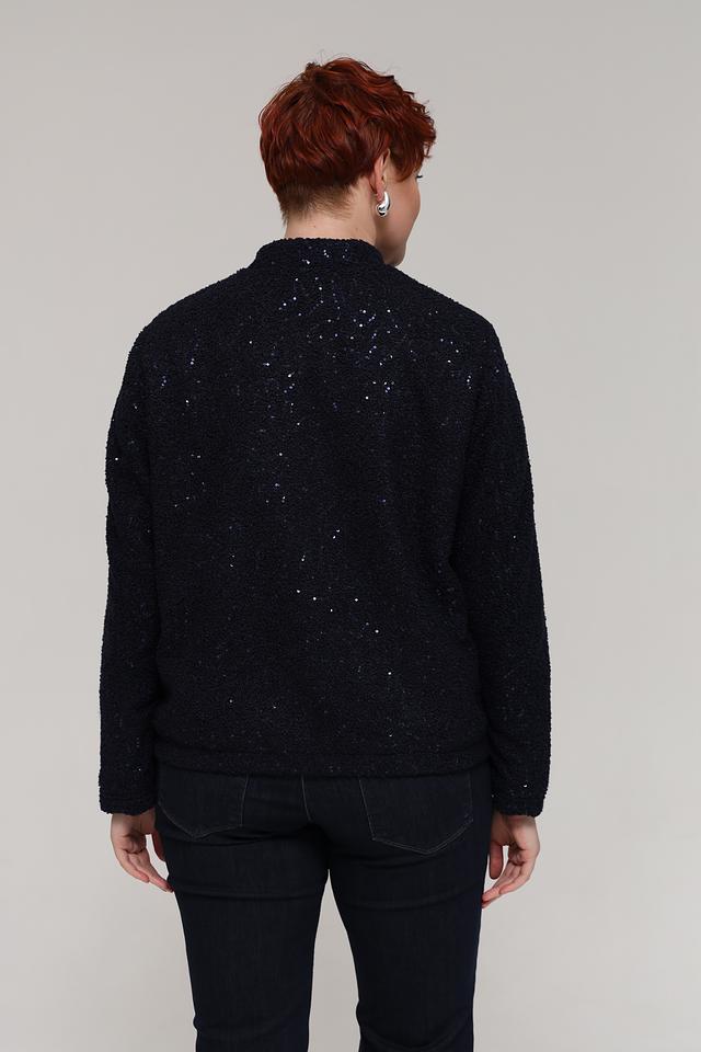 Жакет имеет чёрный цвет с деликатным блеском, который придаёт изделию особый шарм. Текстура ткани напоминает букле, что делает жакет интересным и необычным.