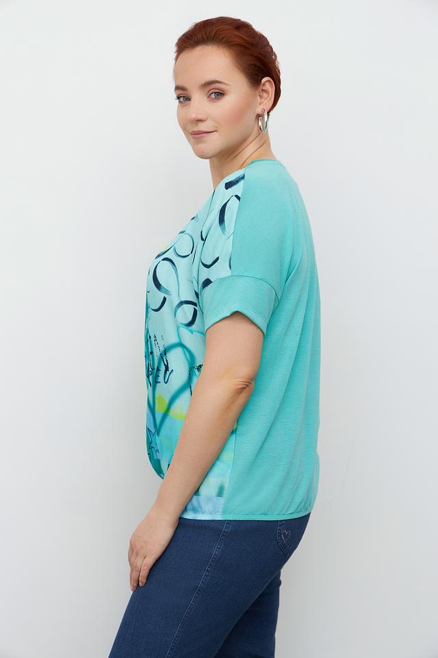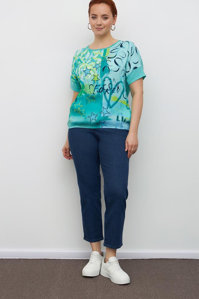 Эта стильная блуза от Rabe collection выполнена в приятной бирюзовой гамме и украшена ярким принтом, включающим звезды и абстрактные элементы.