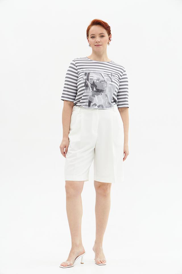 Женская футболка от бренда Rabe collection выполнена в серо-белую полоску. Модель имеет прямой, слегка свободный крой, который обеспечивает комфортную посадку по фигуре.